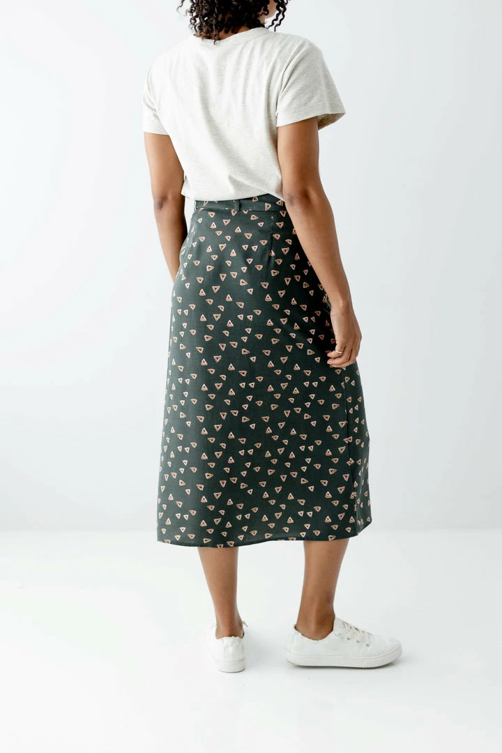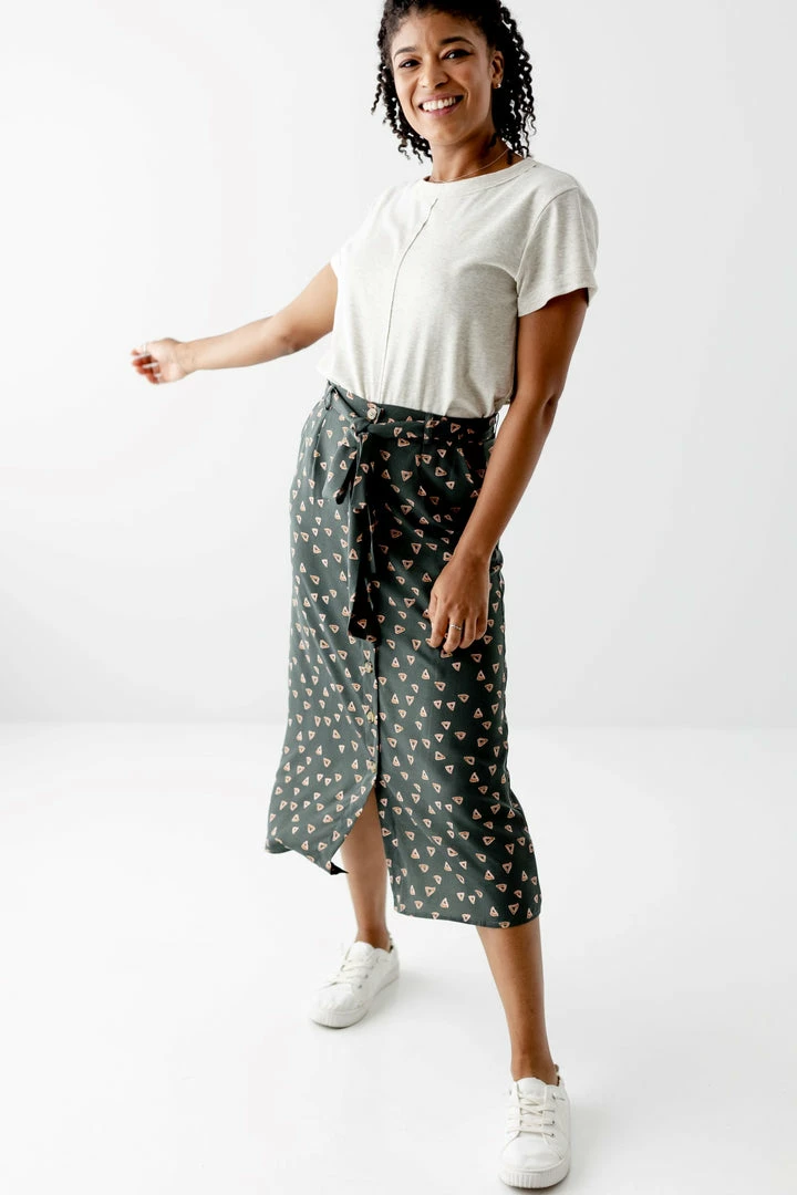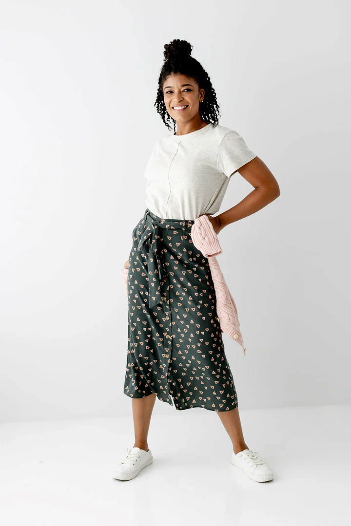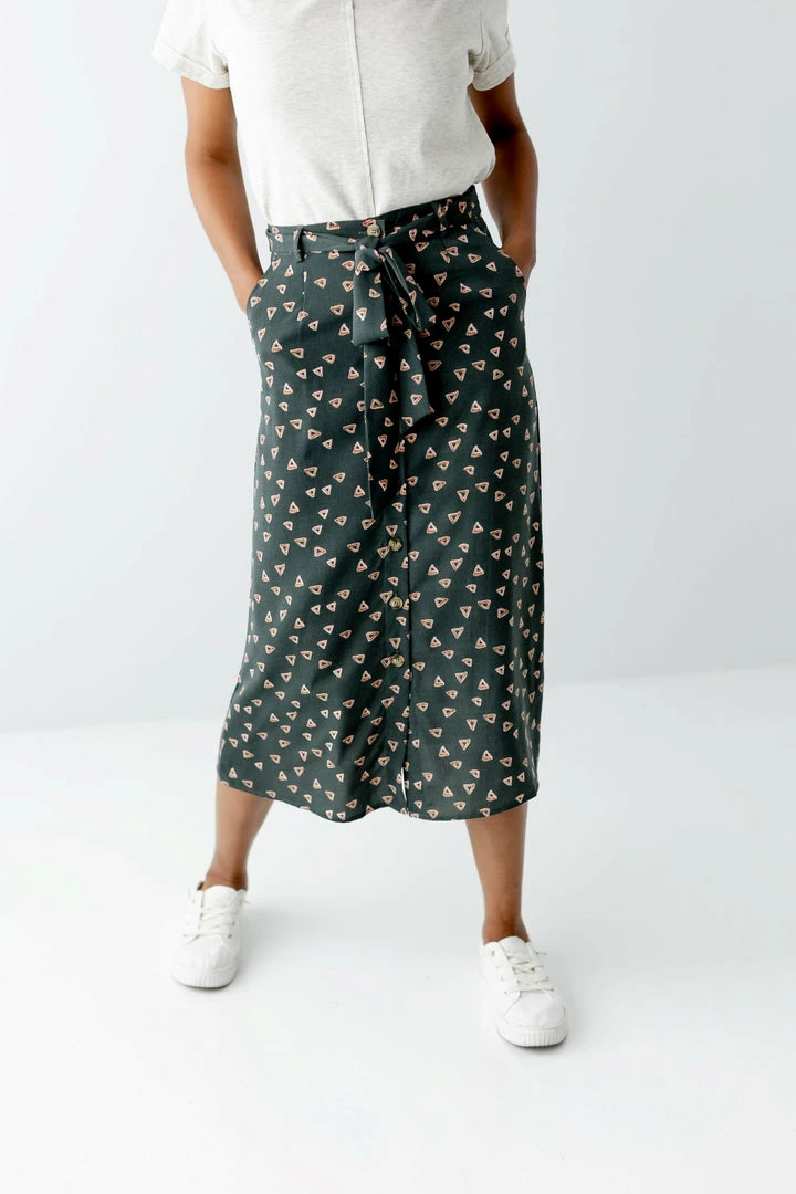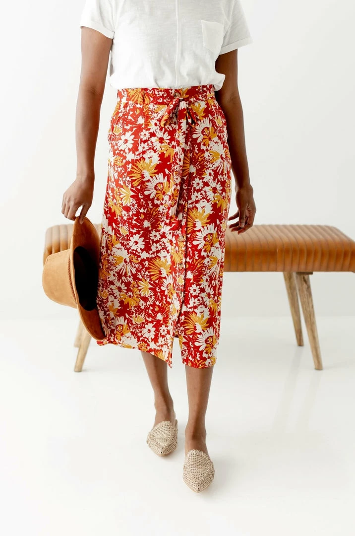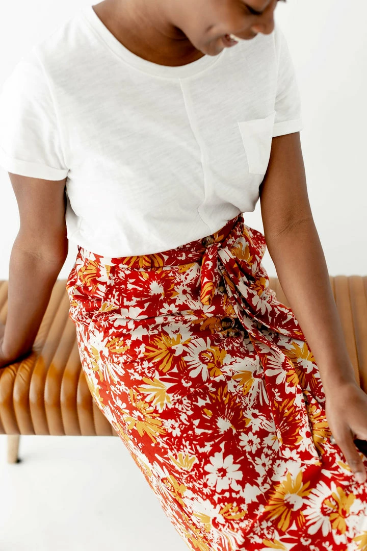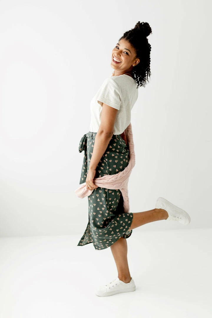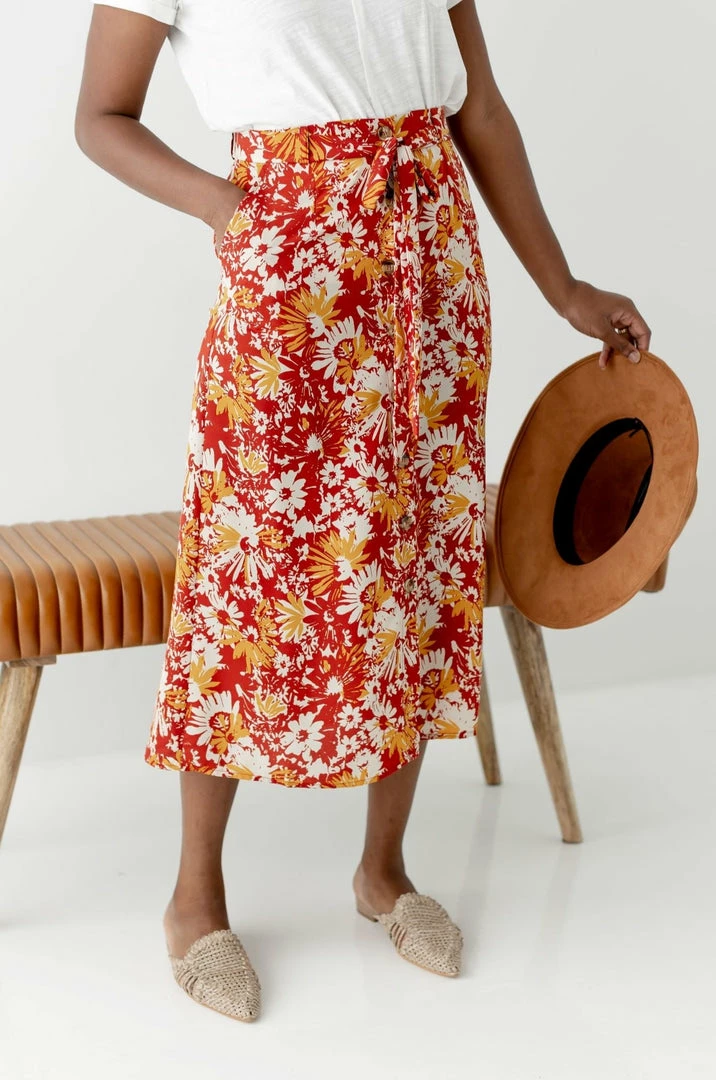 Midi skirts are a trend we love, they are modest, feminine, and they work in any season, making them perfect transitional pieces! The ‘Elaina’ midi skirt has working buttons down the front, pockets, and a belt-tie waistband. Wear with a white tee and sandals for the summer, or a textured sweater and boots for the fall and winter! The hardest decision will be red floral, or olive print?Â