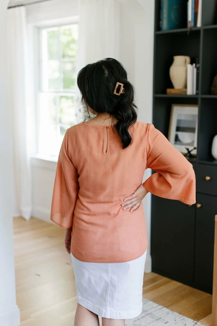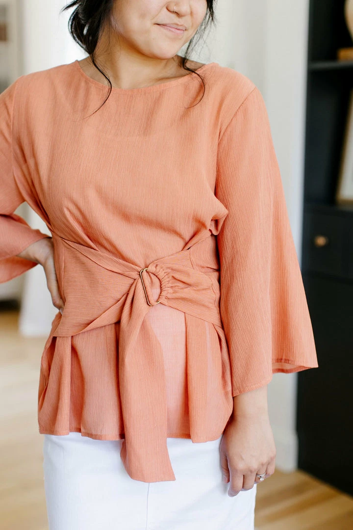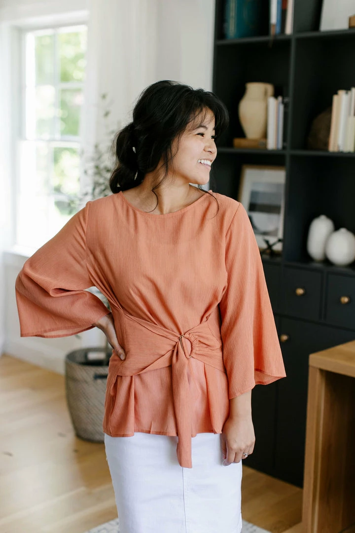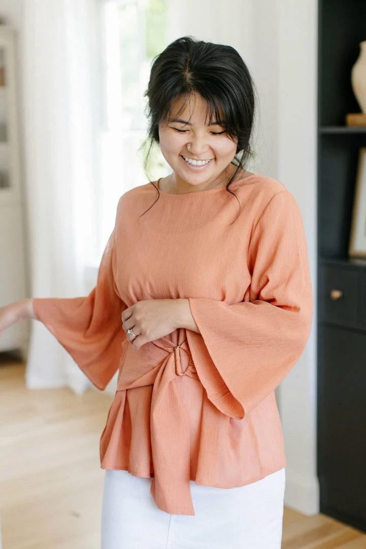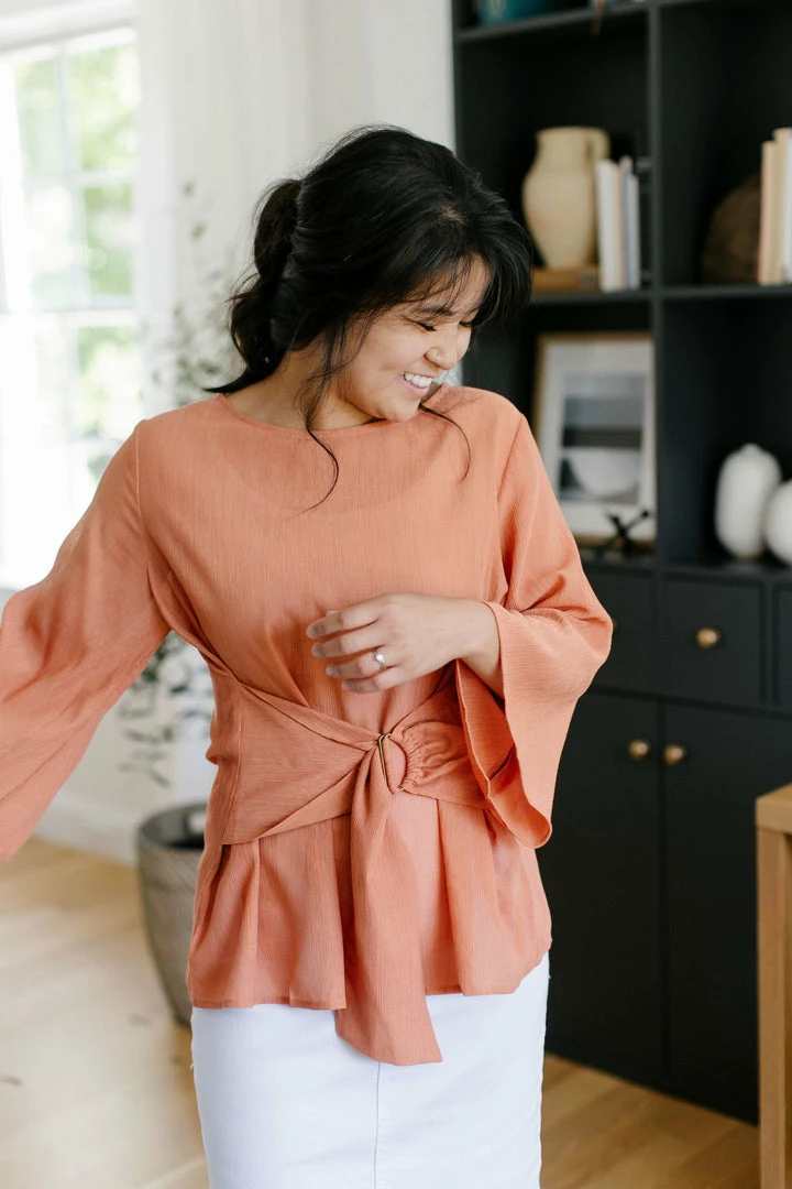Add unique style to your summer wardrobe with the Marina Wrap Top! The elegant look combines a beautiful sash with bell sleeves for a lovely and lightweight feminine look. A cinched-waist silhouette flatters all body types while maintaining modest style. Pair with everything from denim to a pencil skirt for all seasons!