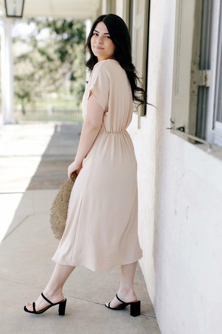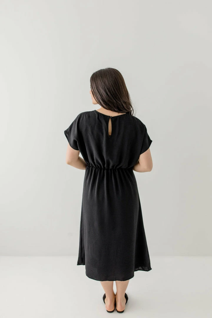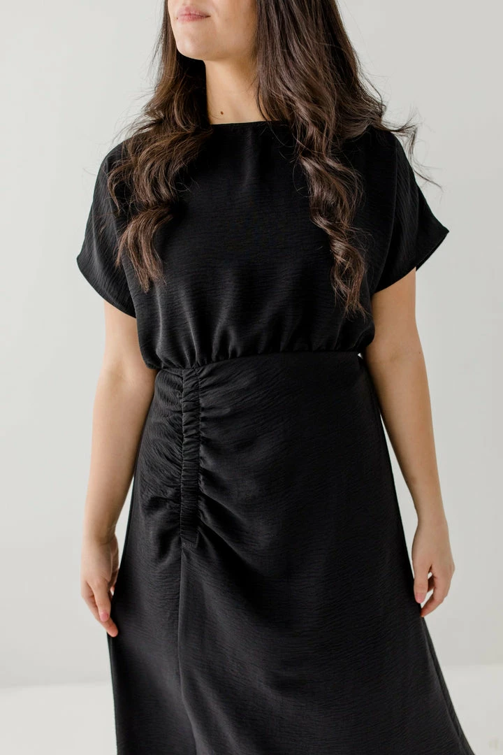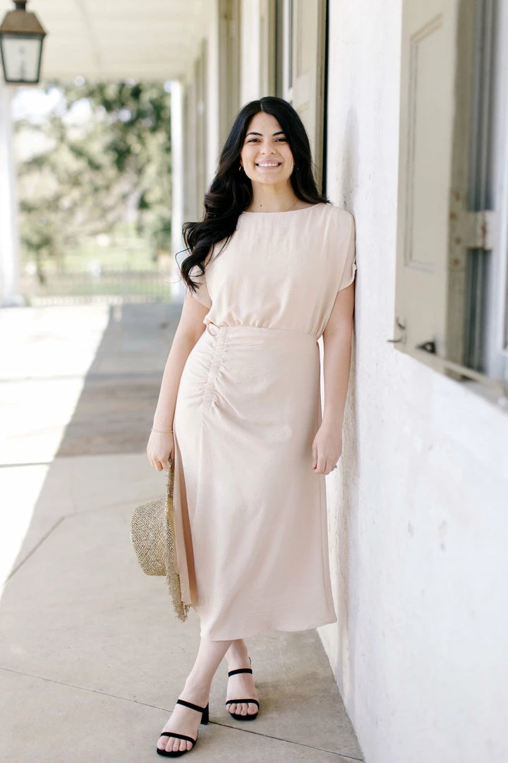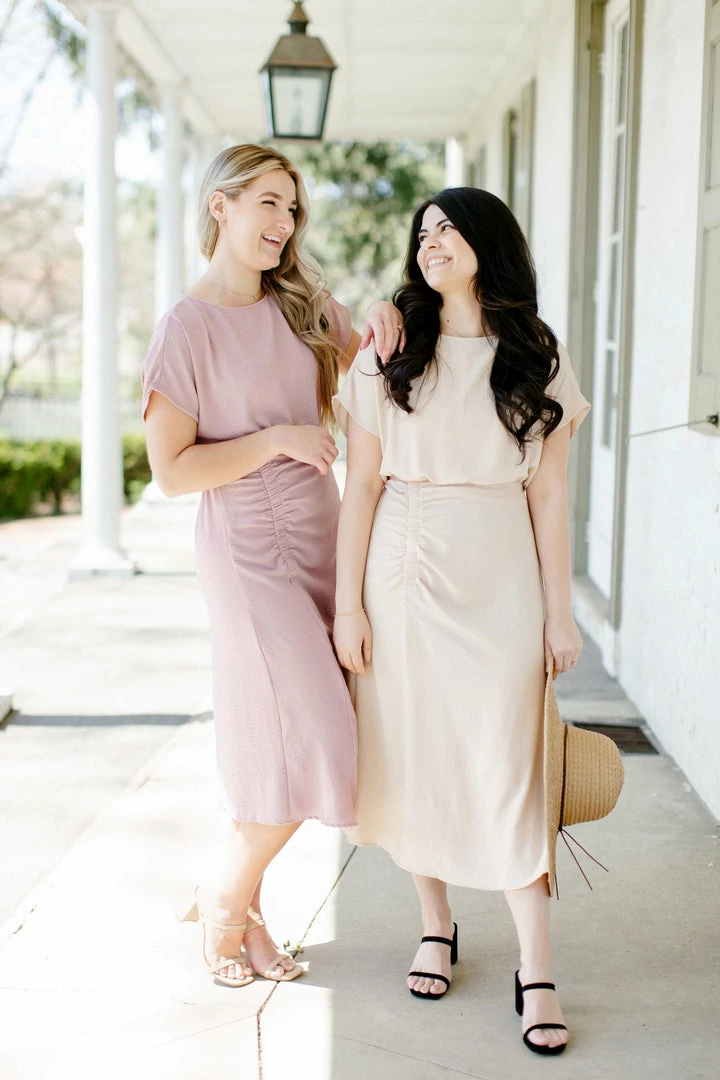 Every woman needs a classic little dress, and the Cruz Dress is the perfect fit! A crew neckline and midi length keep the Cruz a modest pick while shirring detail and gathered waist create a flattering silhouette. Style with block heels for a wedding guest outfit or with woven sandals for an elevated casual look!