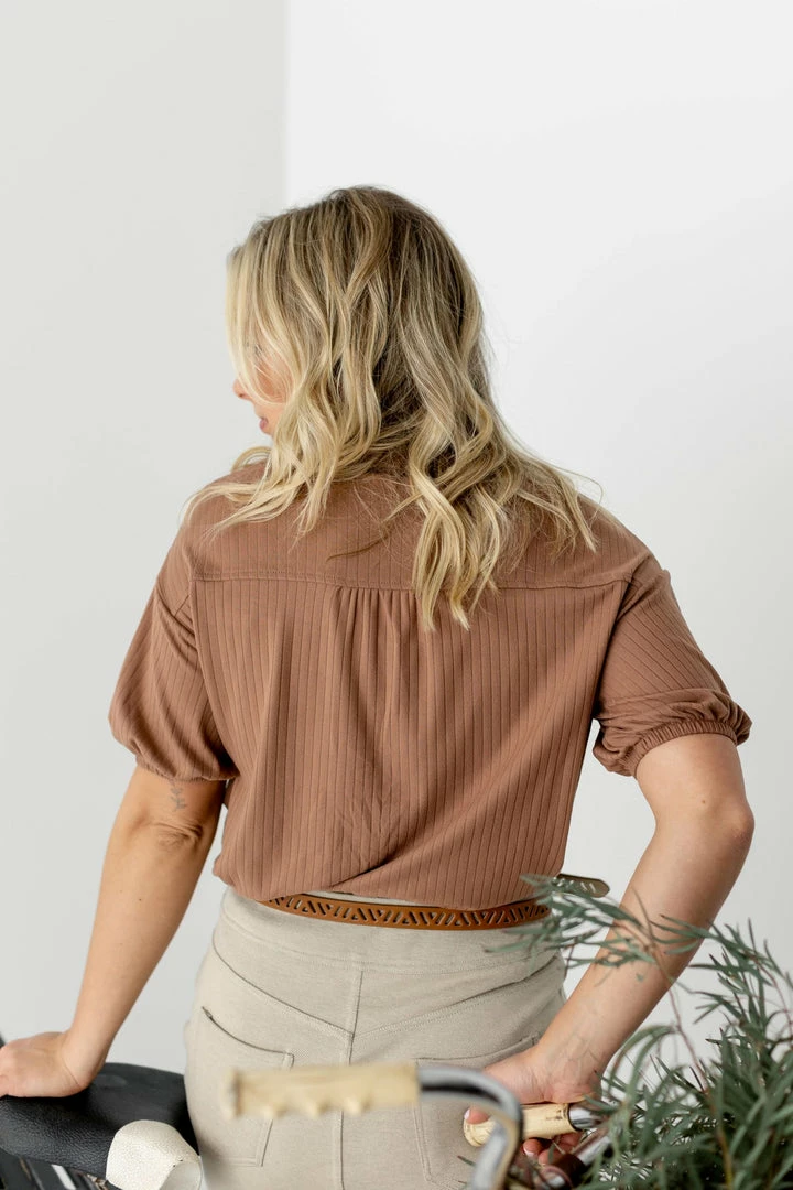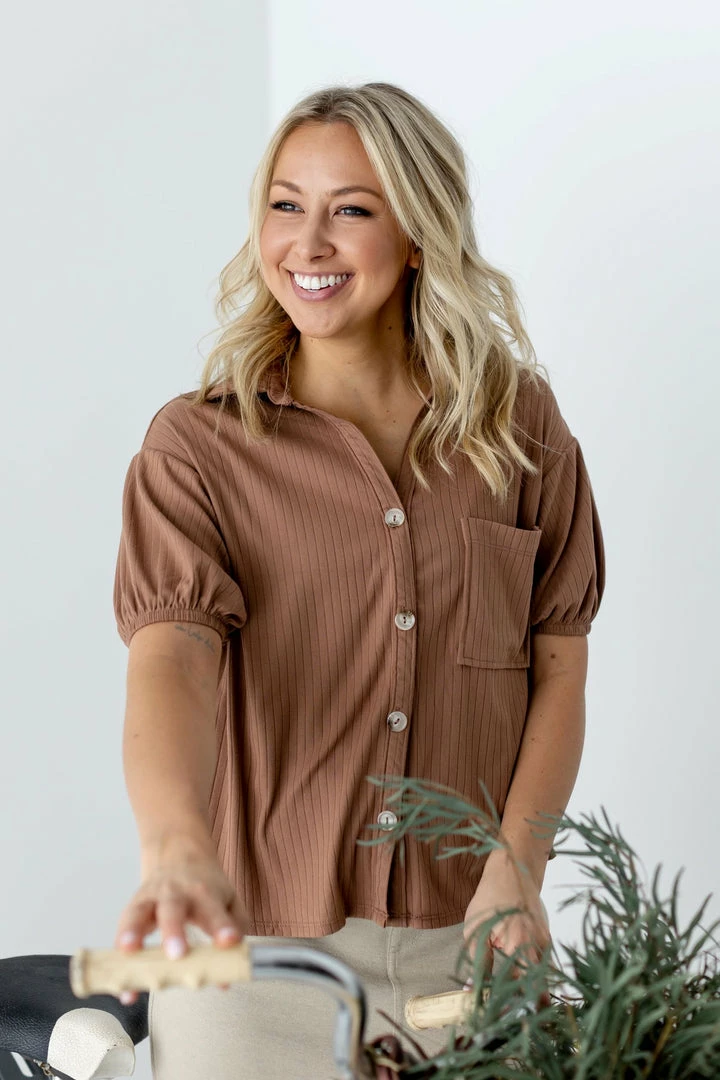 Want a top that is so comfortable you’ll feel like you are wearing pajamas? The Devon Top is here to keep you cozy wherever the day takes you! The classic button down style is given a fresh twist with ribbed fabric, brown buttons and a pocket. Elastic around the short sleeves creates a slight puff sleeve while a regular length cut keep the look flattering. The functioning buttons make this a perfect pick for all the nursing mamas. Style with a denim skirt and sandals for everyday ease!