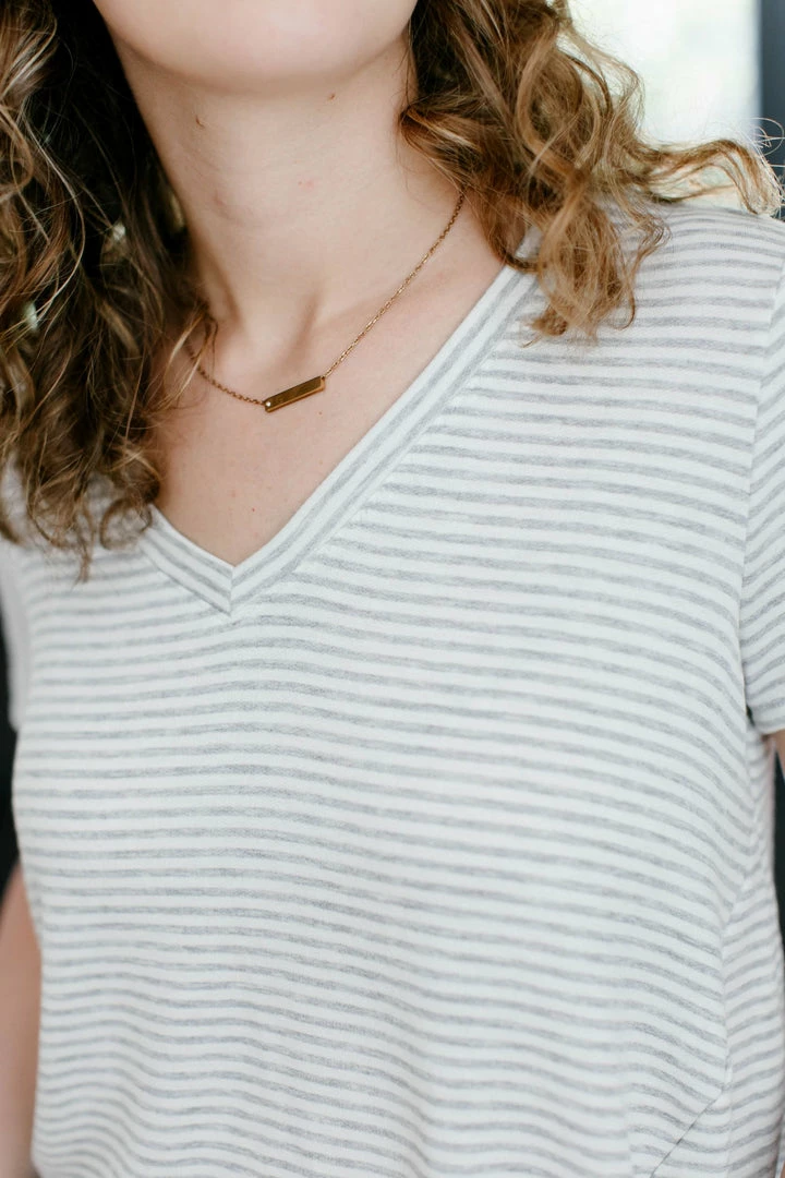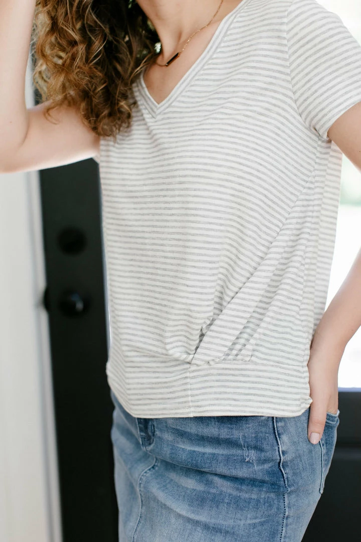 No wardrobe is complete without well-rounded basics, and the Jackie Top makes for a classic piece that you’ll reach for again and again. This short-sleeve T-shirt is cut from soft fabric for breathable comfort from day to night and season to season. A V-neckline gives it chic, timeless appeal, and the overall simple stripe design lets you pair it with any skirt and outer layers for versatile wear. A twist front detailing adds flair to take this tee up a level. From french-tucking into a denim skirt on a warm summer day to layering beneath a cardigan paired with black denim when it’s cool, the Jackie Top will become a fast fave in your everyday wardrobe!