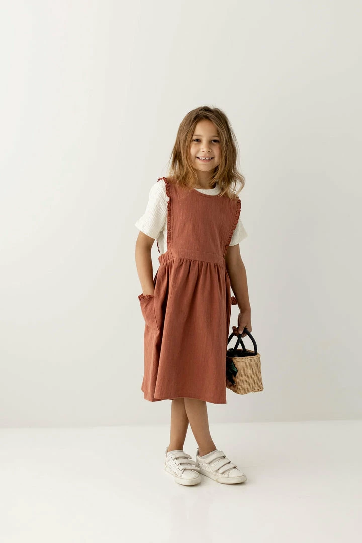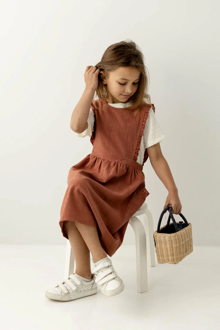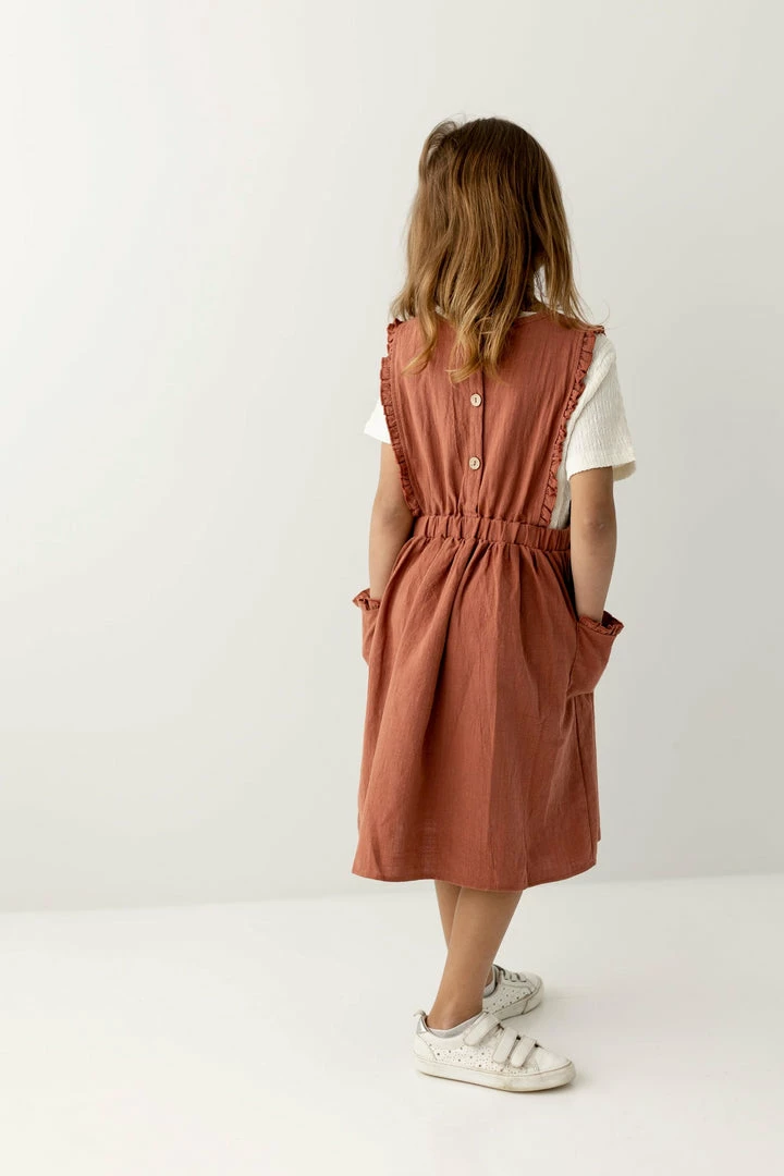 Your little lady will love to wear the Acacia Dress with her fave top and shoes over and over again! Made from 100% cotton, this girls’ pinafore dress makes a fun addition to her casual wardrobe year round. Designed with a round neckline, frilled edges and pockets, smocked waist, and a button-back detail… this cuteness never ends. Wear everywhere, from school to Sunday morning, the Acacia is sure to be your little girls’ favorite!