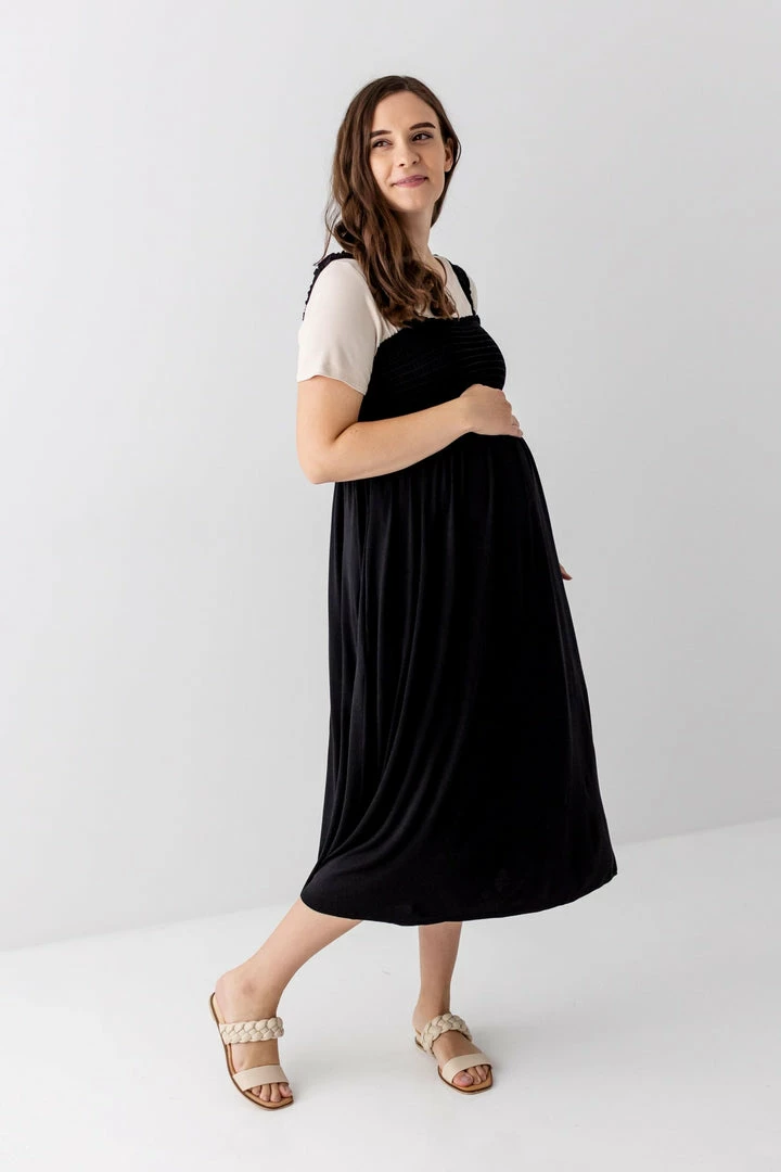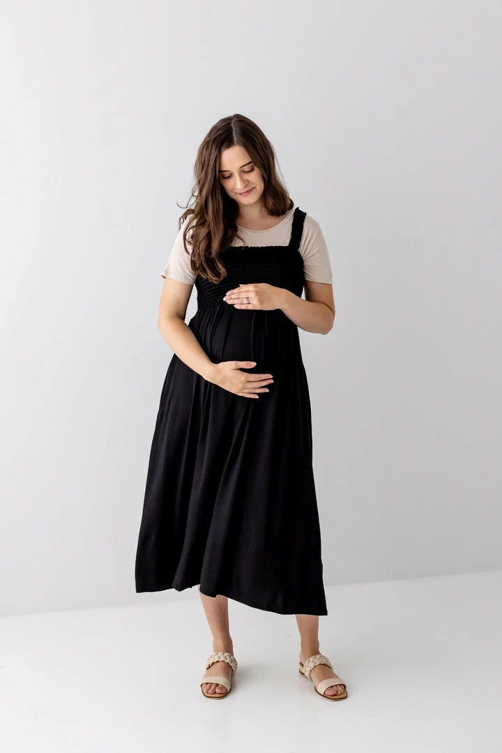 You’ll be reaching for this comfortable, yet cute dress in every stage! The ‘Kelsey’ is a classic shade of black that transitions easily from the weekday to the weekend. The smocked bodice provides a comfy and flattering fit and the skirt has a roomy swing you can wear before, during and after pregnancy. Dress it up with pointed toe flats and a jacket or pair it with sandals for a casual look!