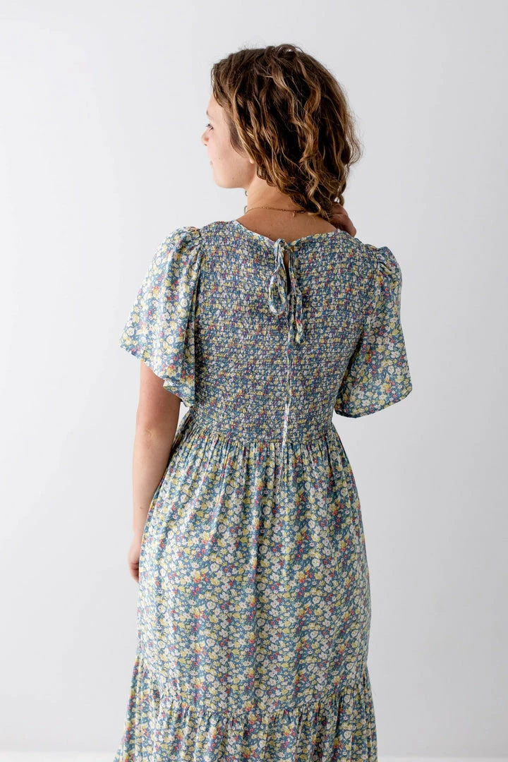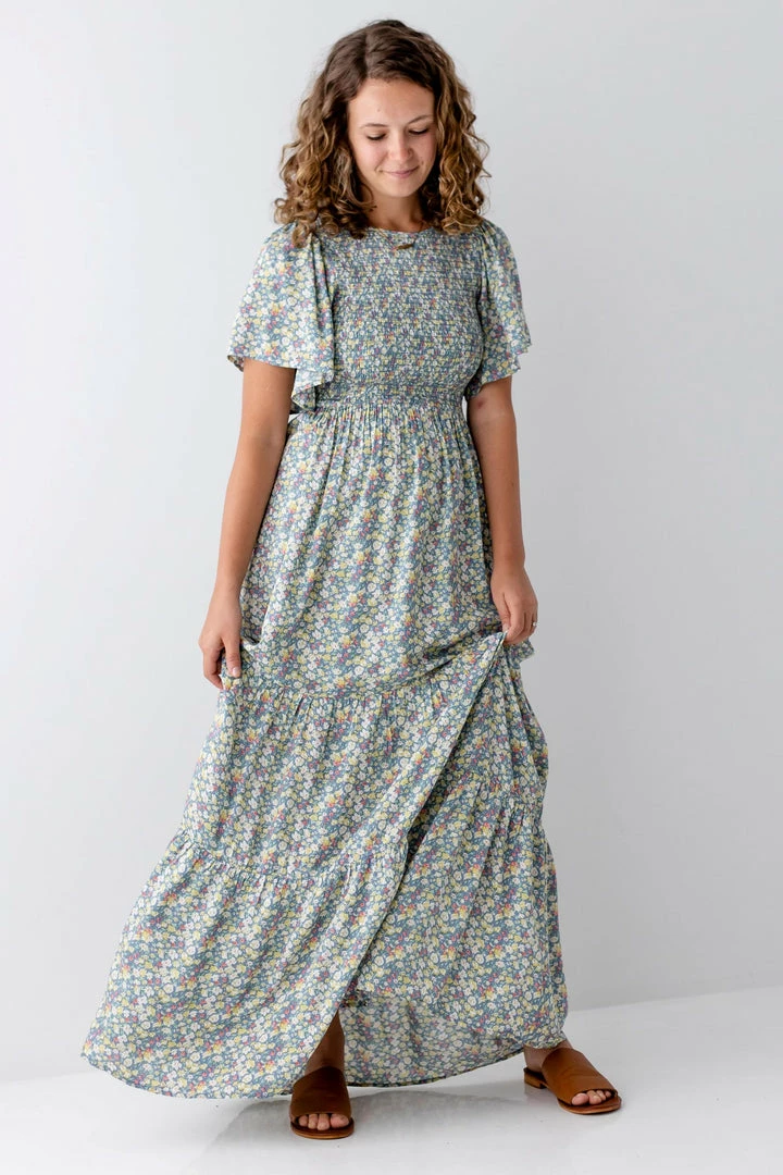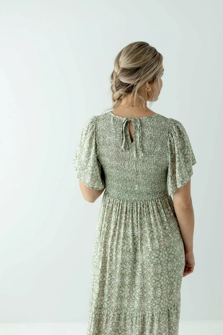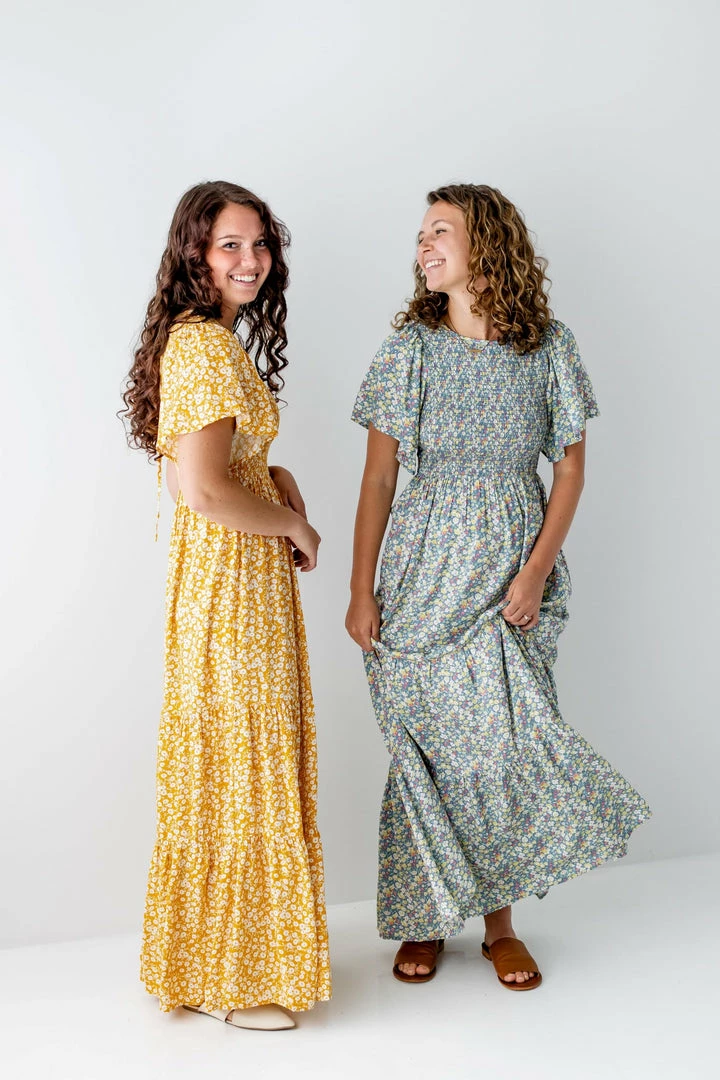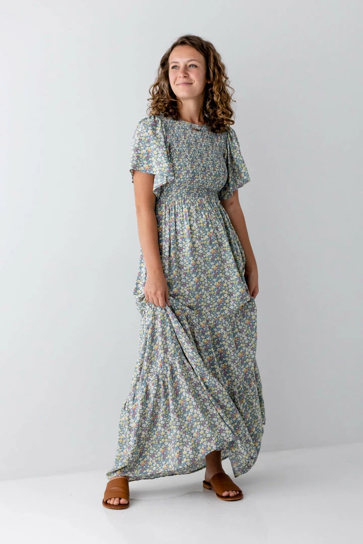 If sunny, summer bliss were a clothing piece, it would be the Everlee Dress! This lovely maxi style dress features a smocked bodice, flutter sleeves and a flowing, tiered silhouette. A tie-back closure and ditsy floral print add feminine flair to the Everlee while still being wearable for everyday life. Pair the Everlee with platform sandals and a straw hat for an summer concert or girls day!
