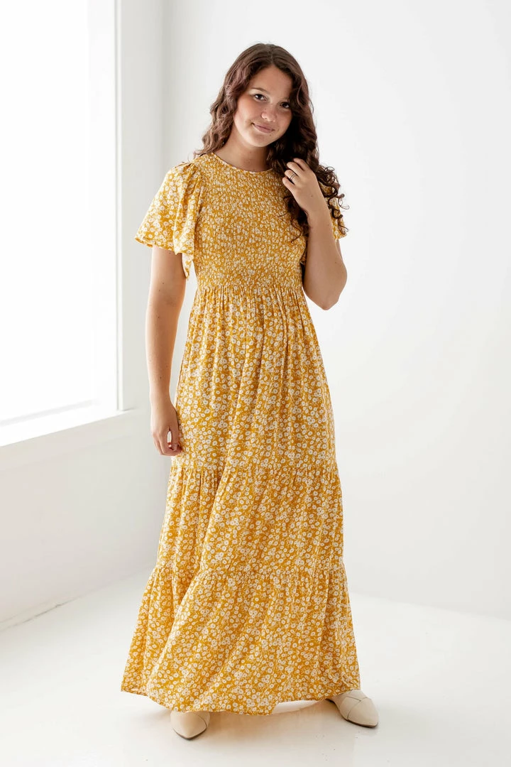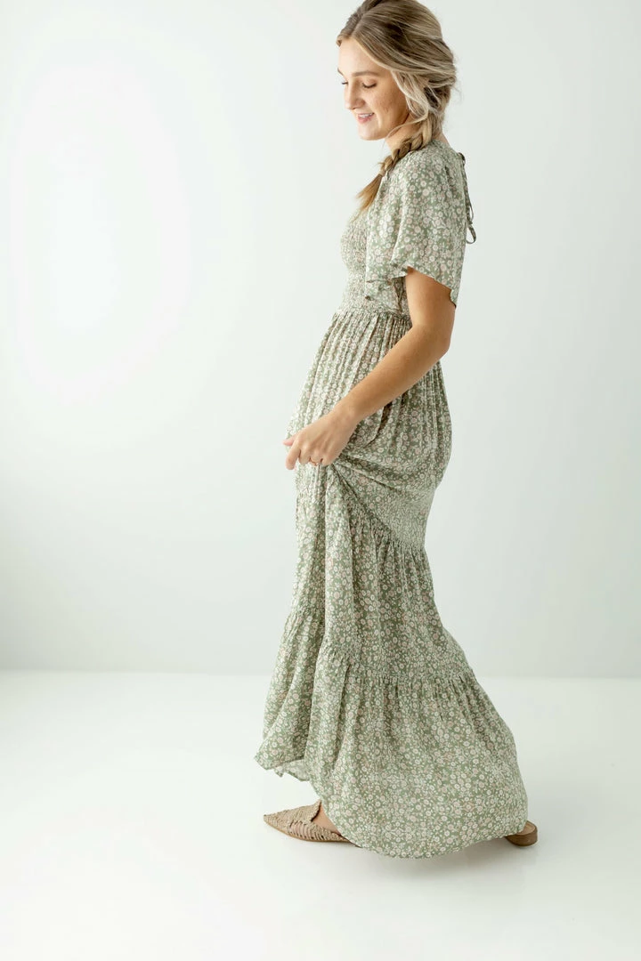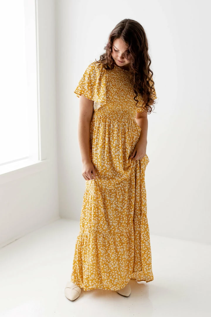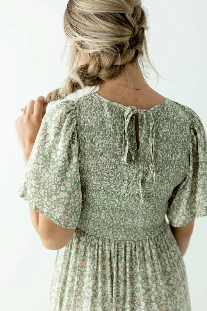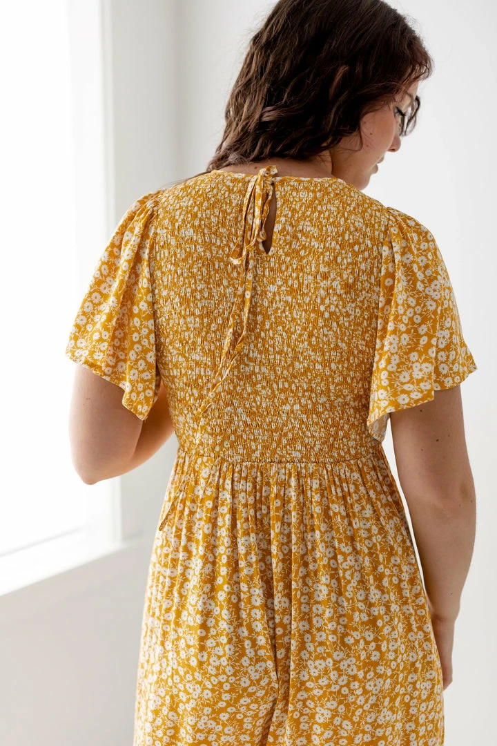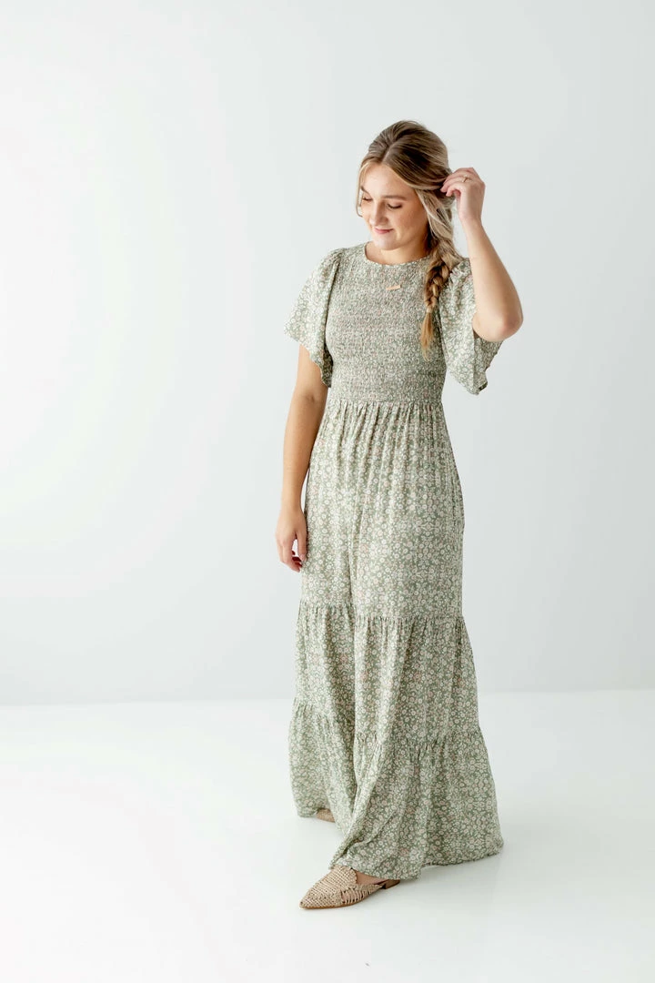 If sunny, summer bliss were a clothing piece, it would be the Everlee Dress! This lovely maxi style dress features a smocked bodice, flutter sleeves and a flowing, tiered silhouette. A tie-back closure and ditsy floral print add feminine flair to the Everlee while still being wearable for everyday life. Pair the Everlee with platform sandals and a straw hat for an summer concert or girls day!
