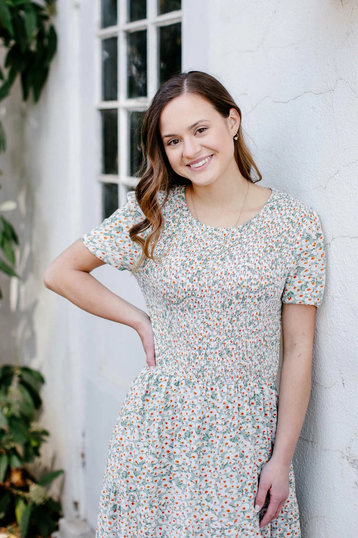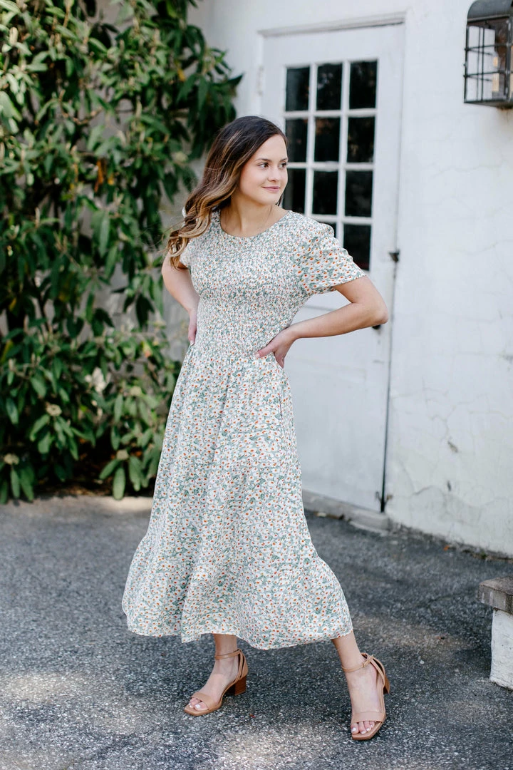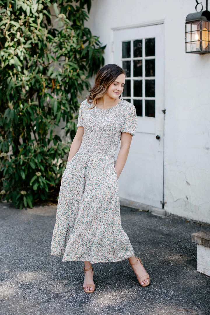 Say hello to all the summer fun in the Portia Dress! This tiered midi dress is constructed from soft, lightweight fabric to let you breeze through the day in breathable all-day comfort. A simple pullover style ensures ease of wear while a flattering smocked bodice, partial lining, and short sleeves complete the look. Pair with your favorite pair of sandals or wedges for any occasion this summer!
