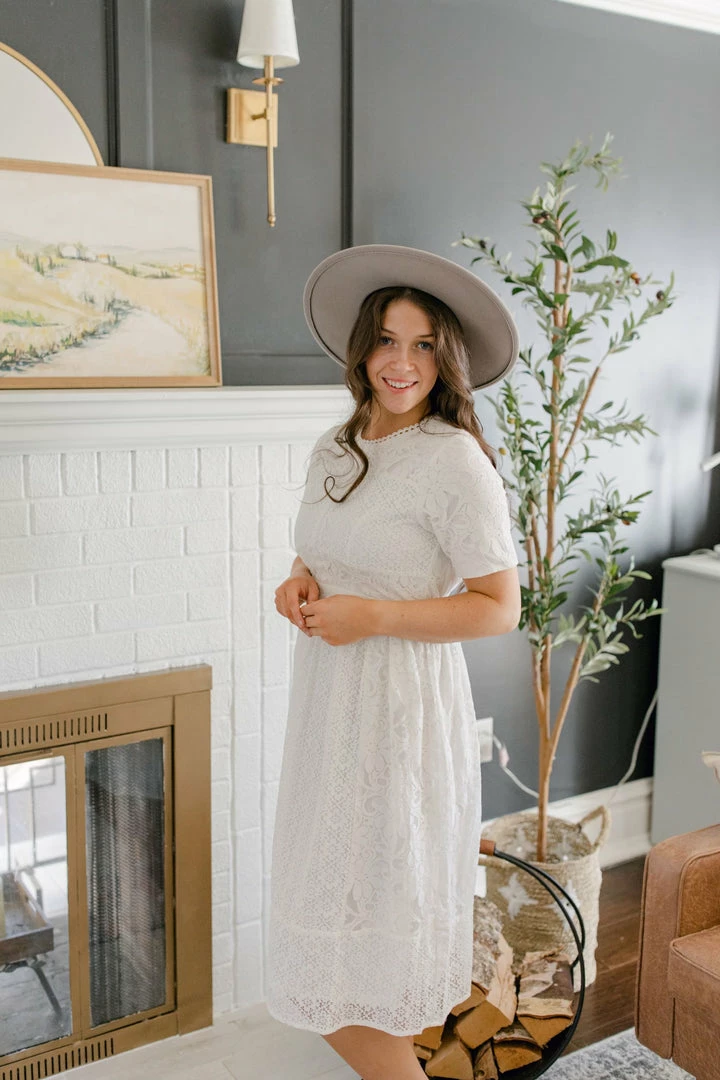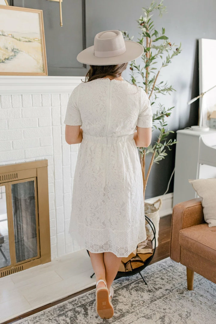 The Serenity Lace Dress features a crew neckline and hidden zipper down the back makes for easy styling. Lace detailing creates a feminine look while the smocked elastic waist in the back flatters all body types. Pair the Serenity with nude block heels to complete the look! This lace midi dress is an excellent option for date nights, a bridal shower, or Sunday morning!