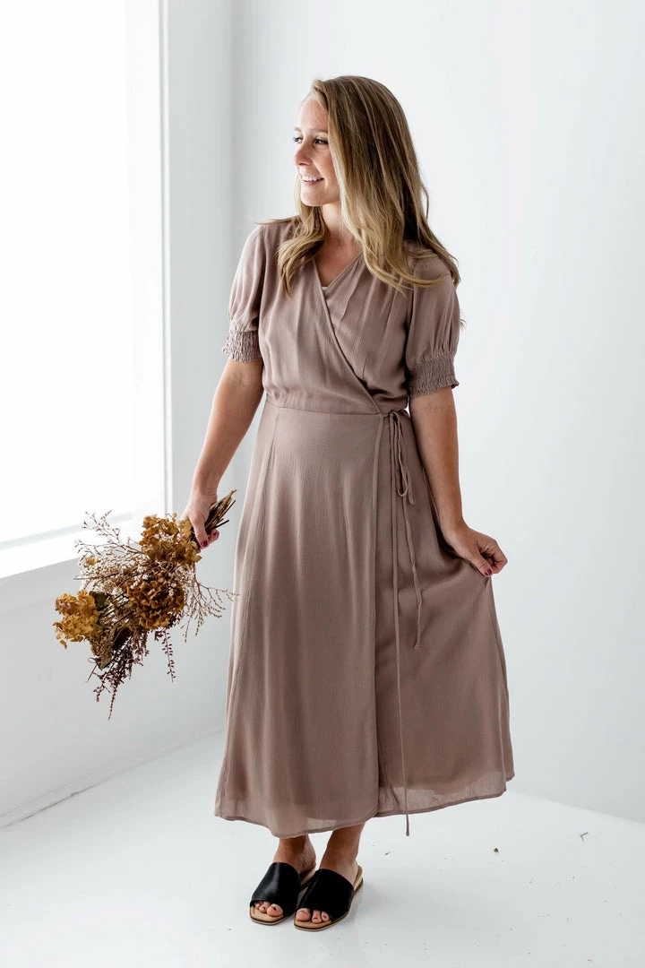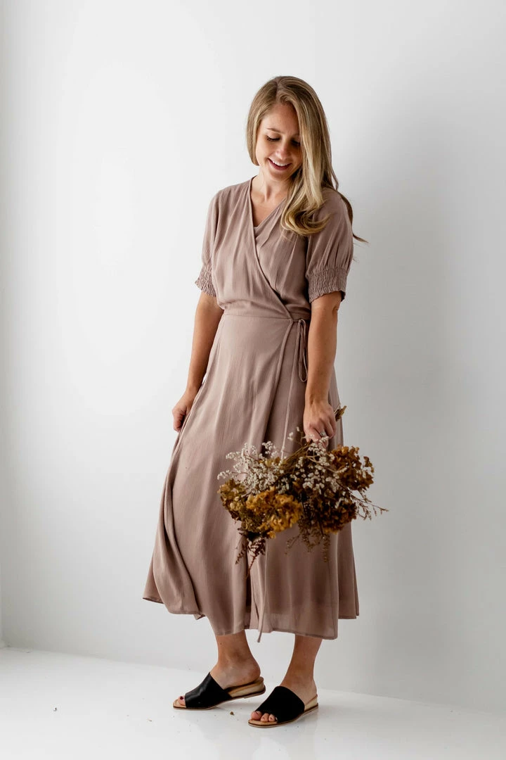 Flowy, feminine, and oh-so-flattering, the Janaya Dress checks all the boxes! Lightweight fabric provides everyday comfort, while the smocked sleeves and true wrap feature add a touch of sophisticated style. Dress up the midi-length Janaya with sandals or down with sneakers, this versatile dress looks flattering every way you wear it!Â