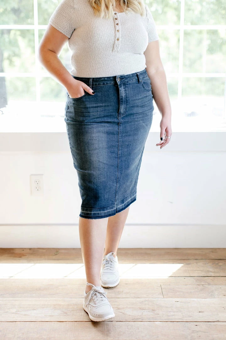And that’s why we’ve created this ultimate live-in, knee-length denim skirt for you!