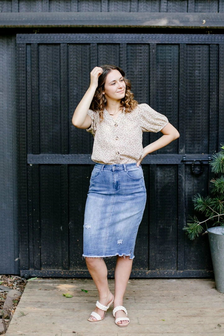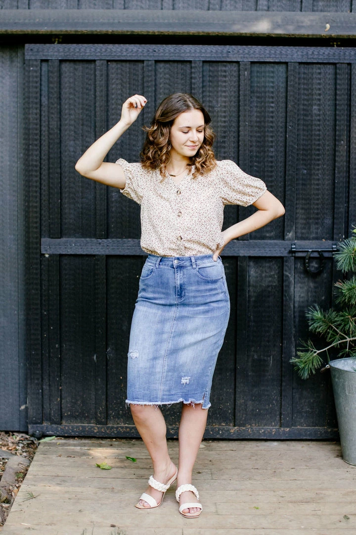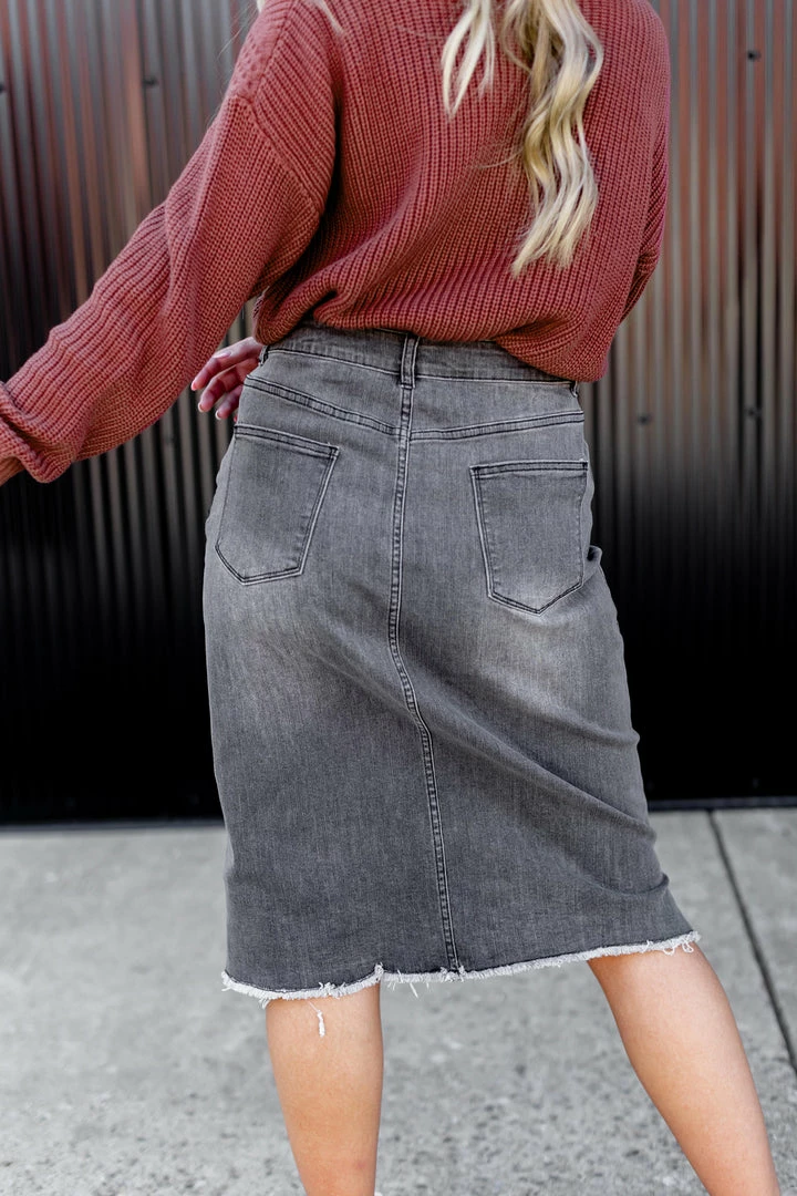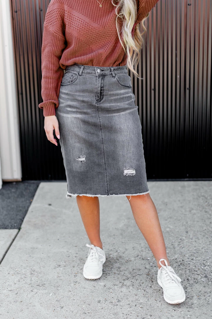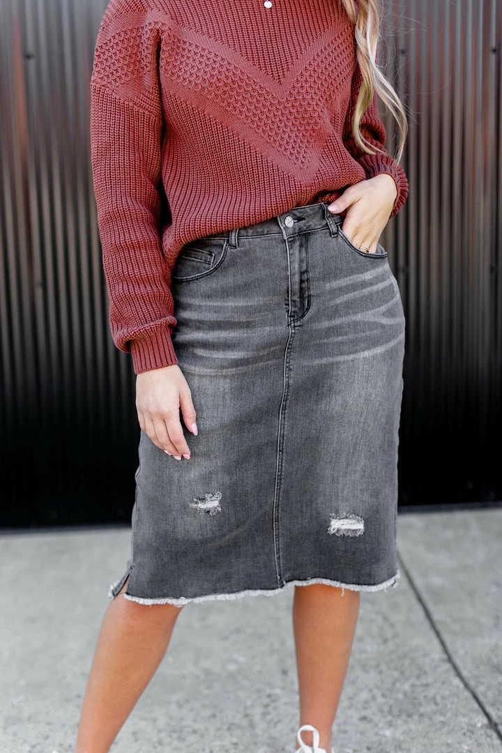 A new take on the classic denim skirt, the ‘Eden’ is soft, stretchy, and a staple in every season! Stay on trend with the distressed wash and flattering fit. The durable stretch denim and has patches behind the distressing and a raw hem with a hi-lo detail. Pair the ‘Eden’ skirt with a simple graphic tee and you’re ready to relax around a campfire or go for an ice cream run!