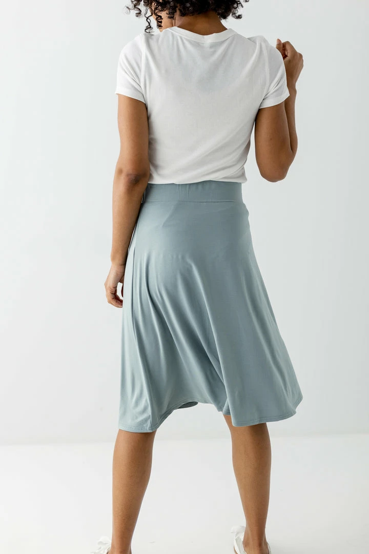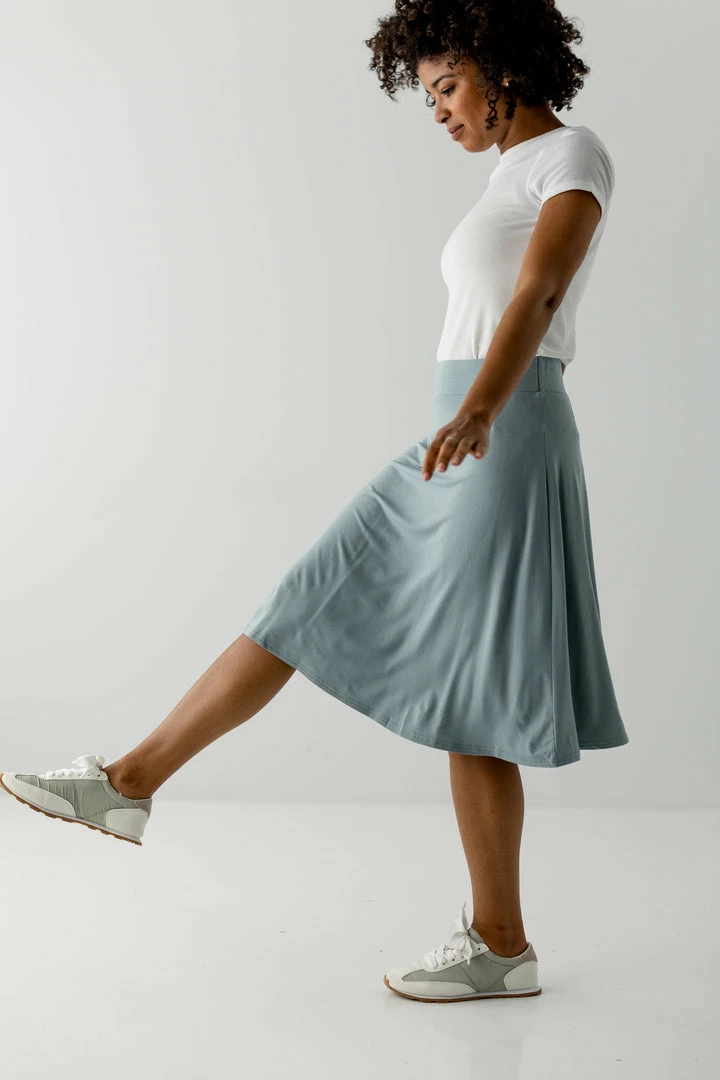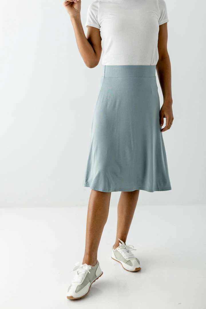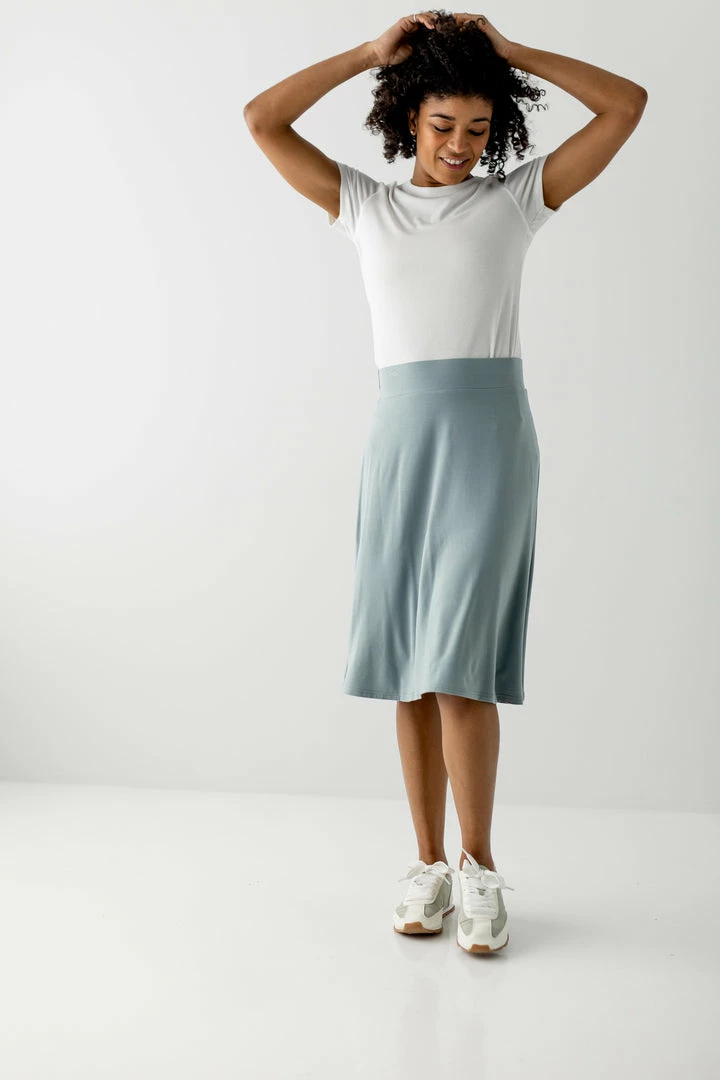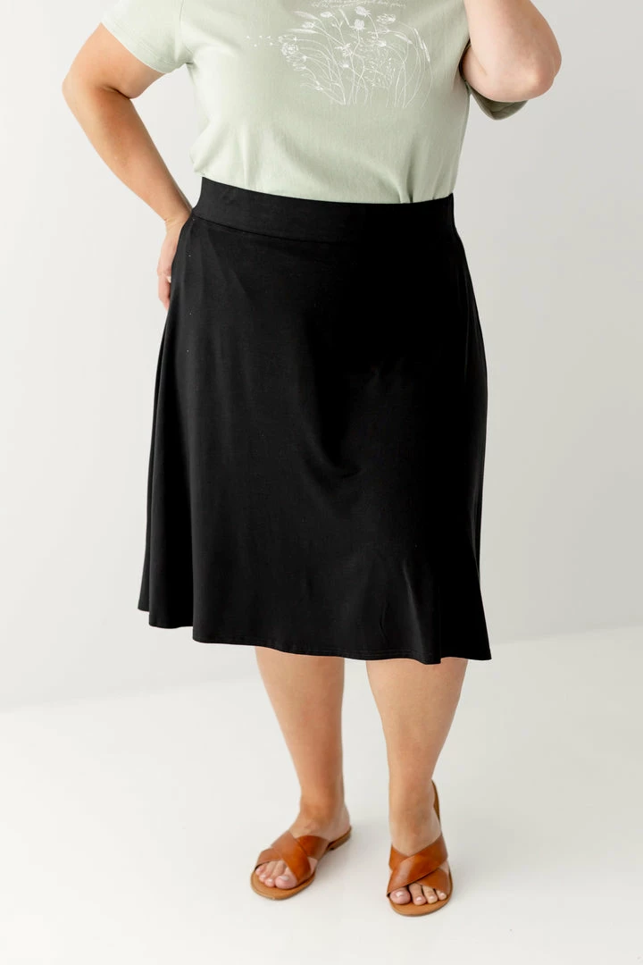 A perfect option for a camping adventure, running errands, sitting in the classroom and everything in between! The knee-length ‘Eva’ Skater Skirt is made a from a soft, high quality knit and has a comfortable waistband for easy styling and all-day comfort. Add freedom and confidence to your everyday routine whether you’re relaxing or running around!Â