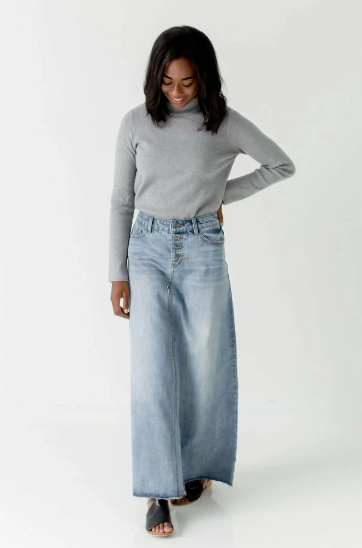 The ‘Haven’ long denim skirt is modest, classic, and designed for real, everyday women – and it’s 100% cotton!Â