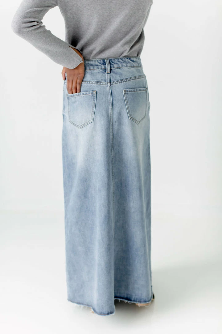The ‘Haven’ long denim skirt in light wash is perfect for:Â