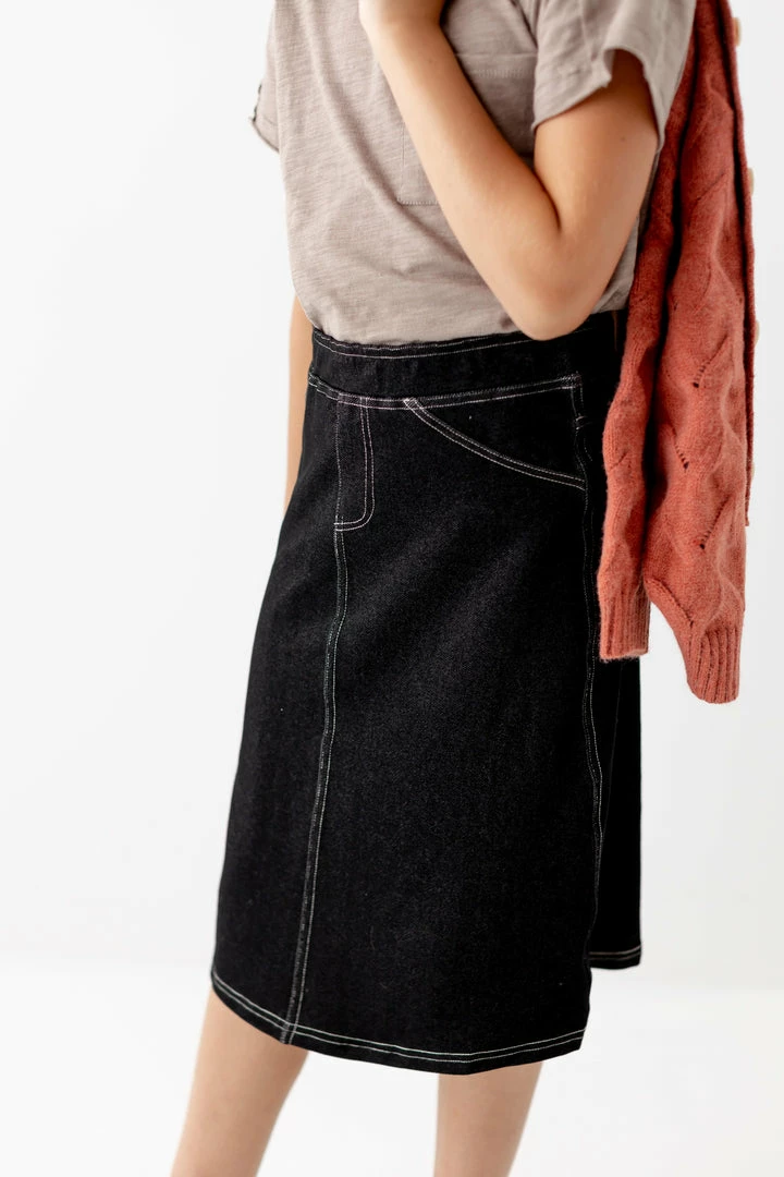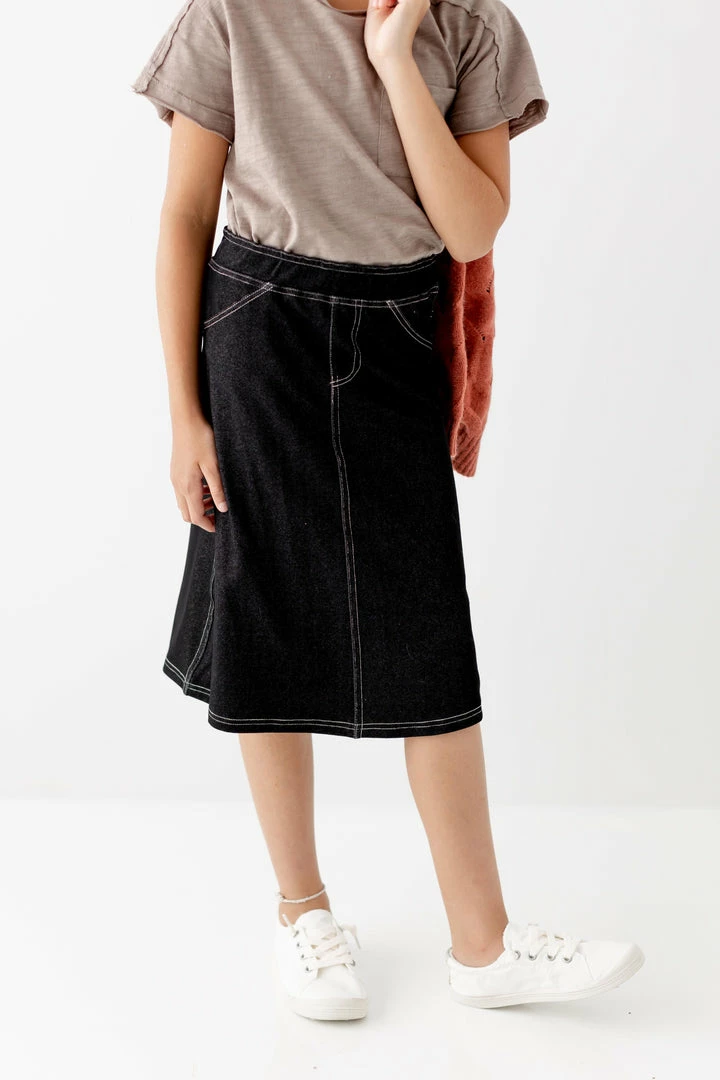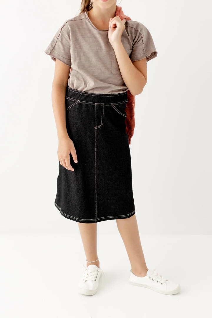 Looks like denim, feels like a dream! There’s room to move in the comfortable ‘Piper’ skirt! With easy pull-on style and functional back pockets, this skirt will quickly become a favorite in any girl’s closet.Â