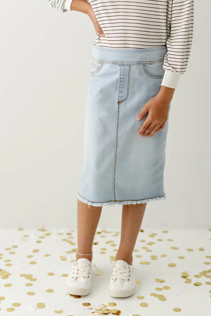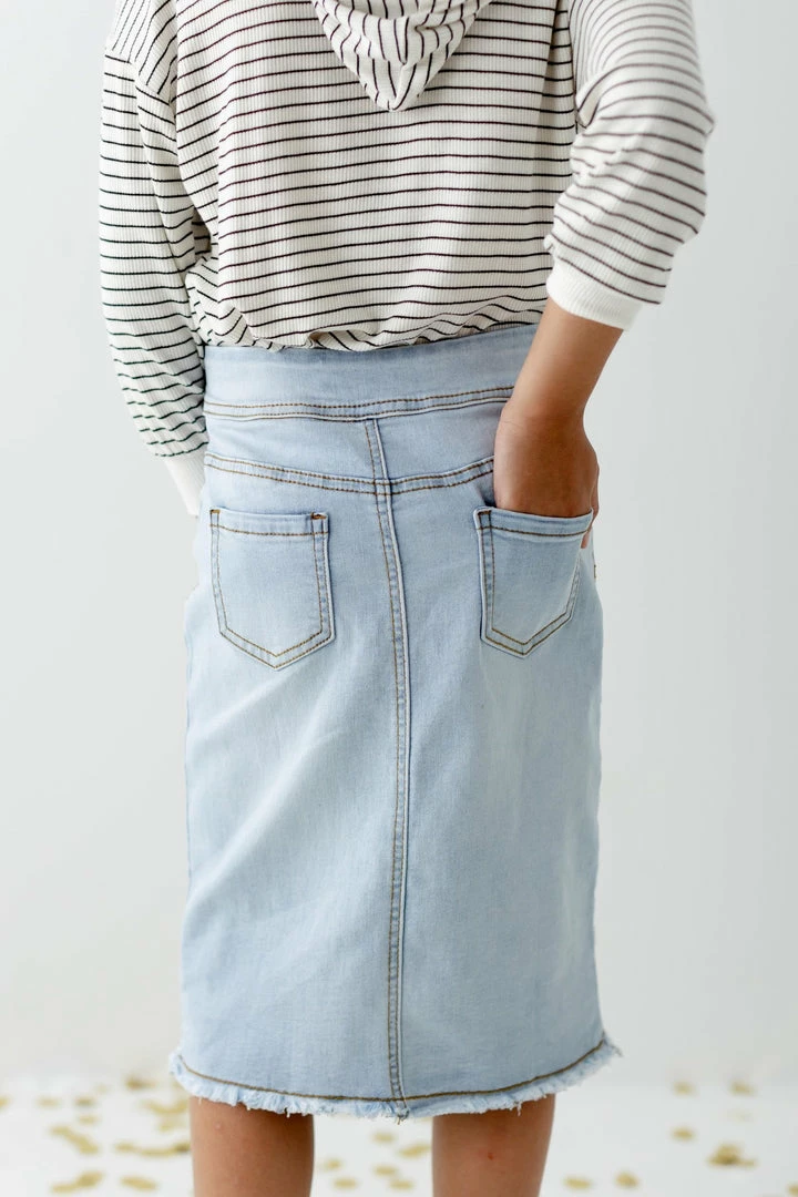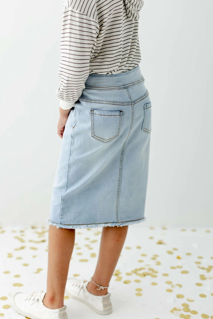 An easy go-to with classic lines and a comfortable waistband. The ‘Sara’ is soft and stretches easily but still looks and feels like a denim skirt. Pair with a simple tee on warm, summer days and transition easily with legging and long-sleeves when the temperature drops. The ‘Sara’ looks good in every season!