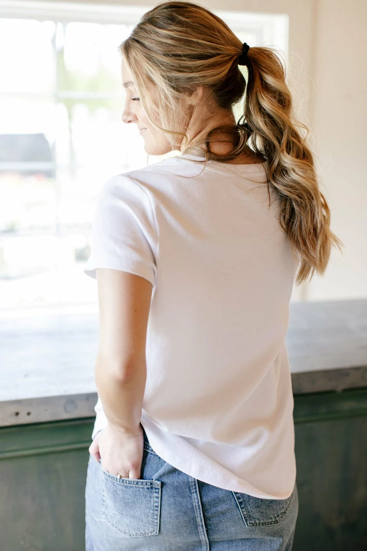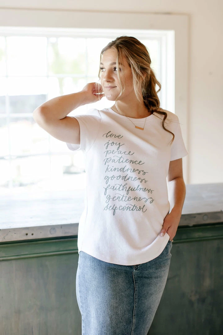 We love the way the elegant script paired with a cheerful pop of color brings this graphic tee to life! The nine virtues listed are a sweet representation of Galatians 5:22-23. We hope this design will draw people in and give you the opportunity to share the Fruits of the Spirit.Â