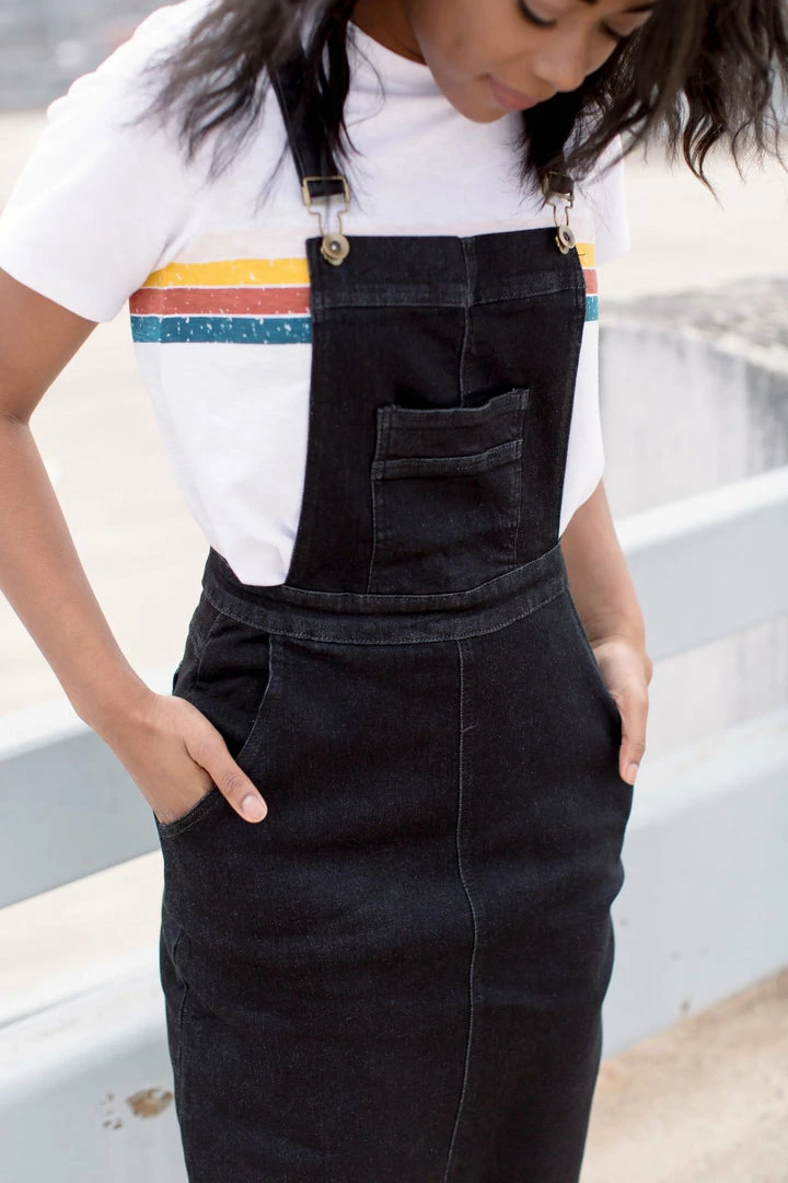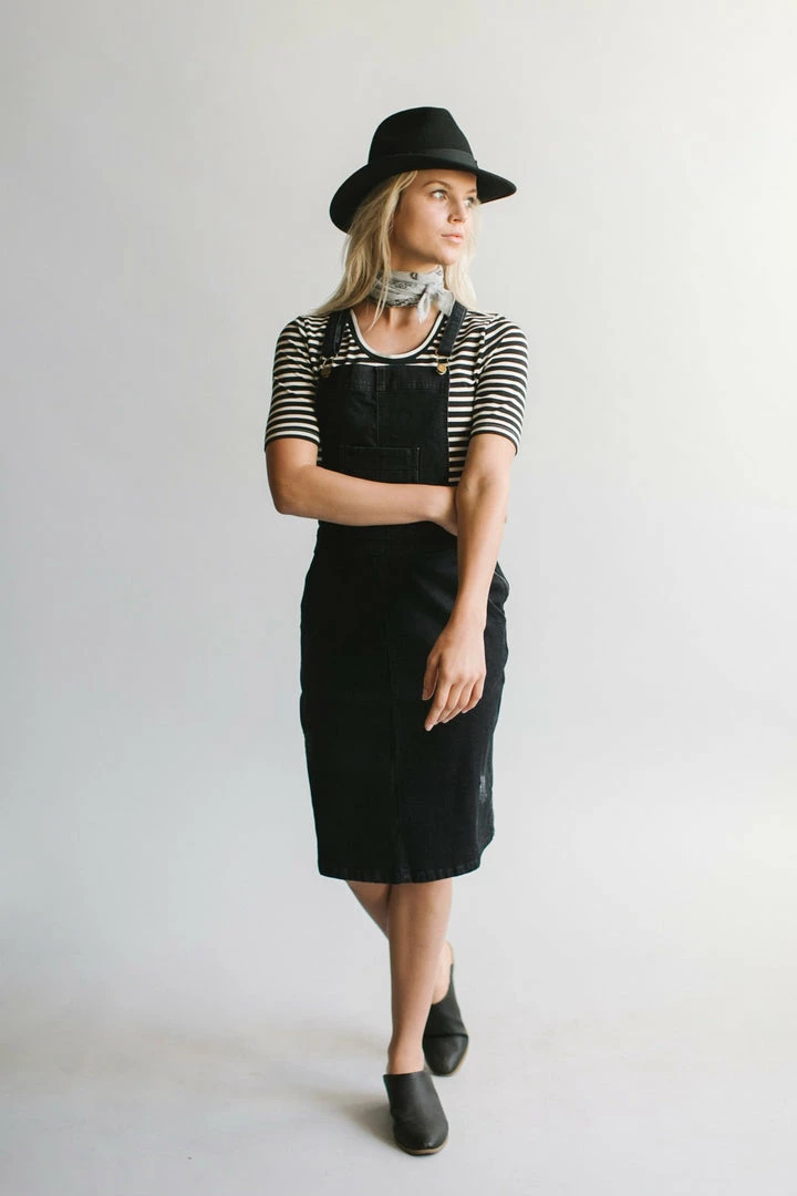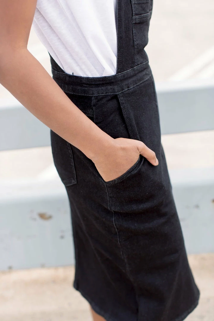 These black denim skirt overalls will add some fresh style to your wardrobe while remaining modest.Â