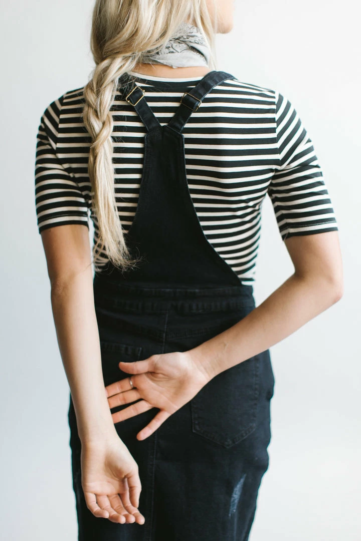 These black denim skirt overalls (which are 95% cotton, by the way!) can be paired with these items listed below.Â