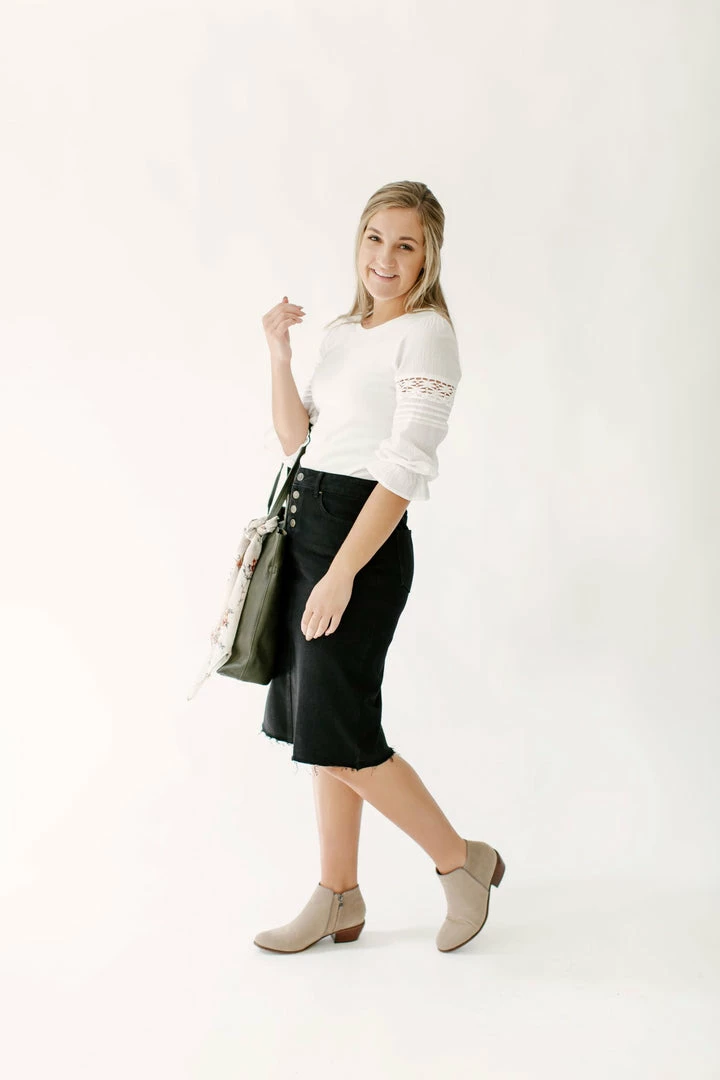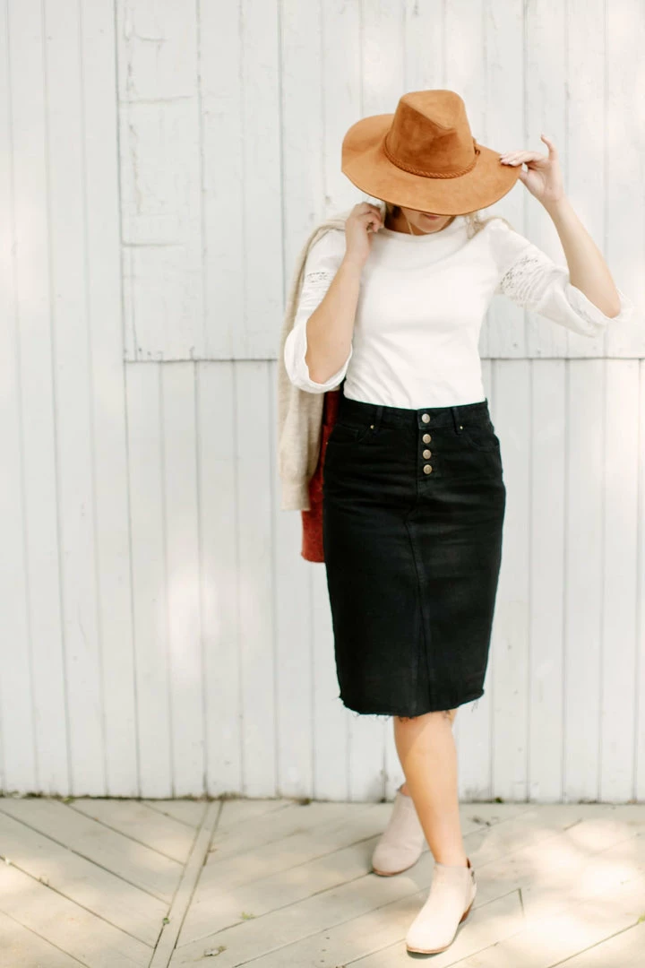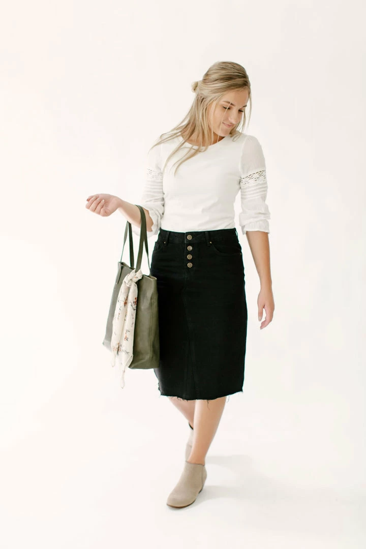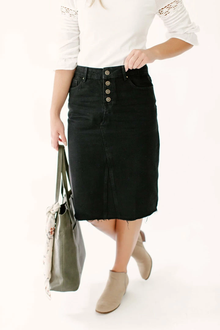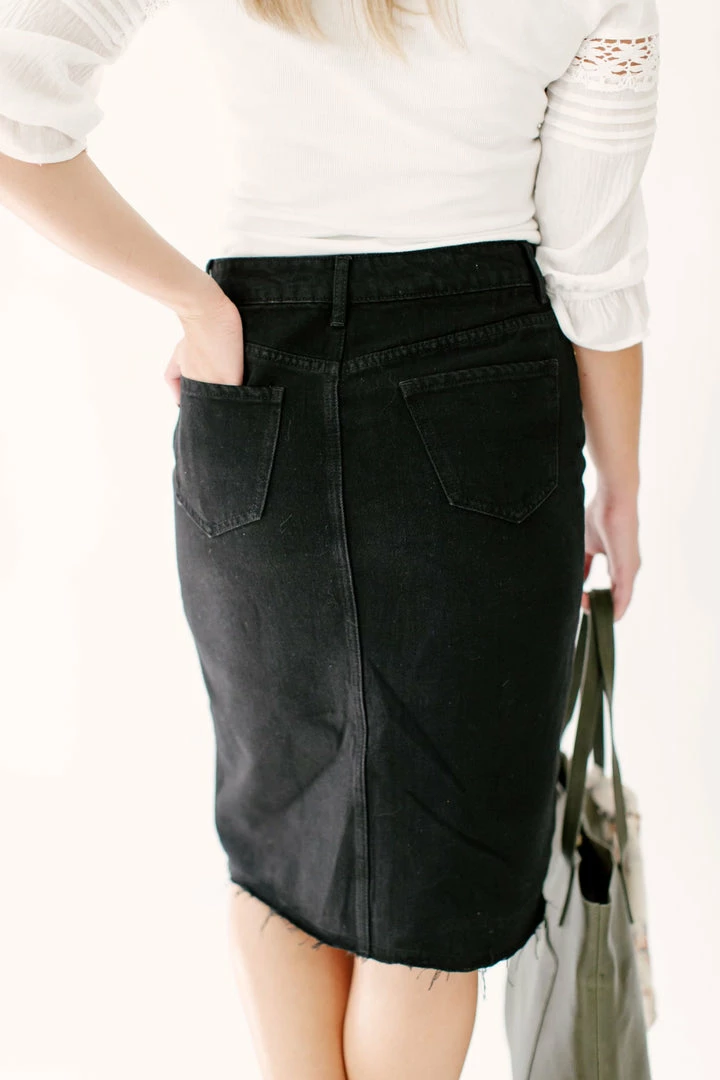 Classic with a hint of vintage. The well-loved ‘Haven’ skirt is here in a solid black denim wash with the same great details! Created with an A-line design, this skirt works well for a variety of body types. Tuck in a retro graphic tee to get the high waisted effect or pair with a chunky sweater for the perfect cozy vibes. You’ll be reaching for this versatile denim skirt in every season!Â