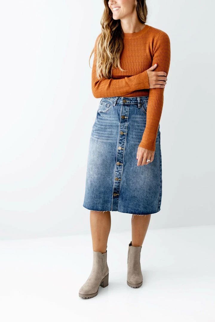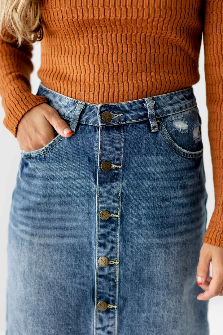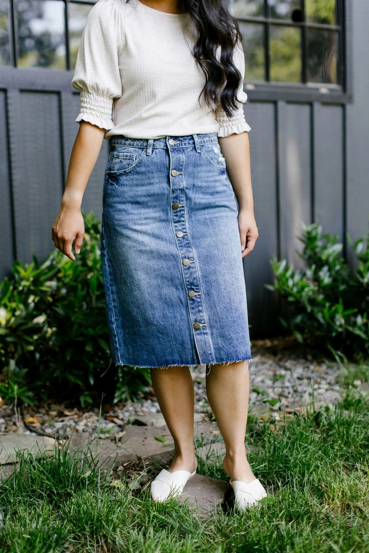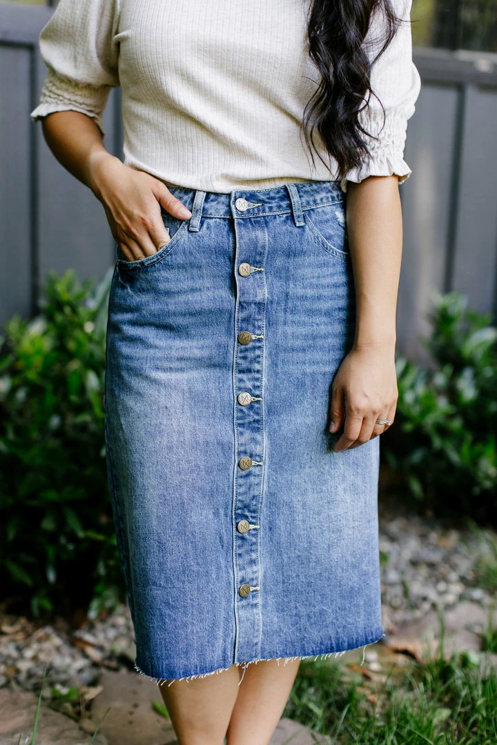 The perfect combination of vintage and feminine – the ‘Hilda’ denim skirt walked straight out of the 90’s into your closet! A distressed denim skirt is one of our favorite staple pieces and the details in this one are exceptional! Quality no stretch denim, a slight A-line style, functioning pockets, brass buttons and a raw hem. Easily transitional; you can wear it with sandals and your favorite tee for the summer or pair it with a sweater and boots for the fall! Exclusively designed by us for you.Â