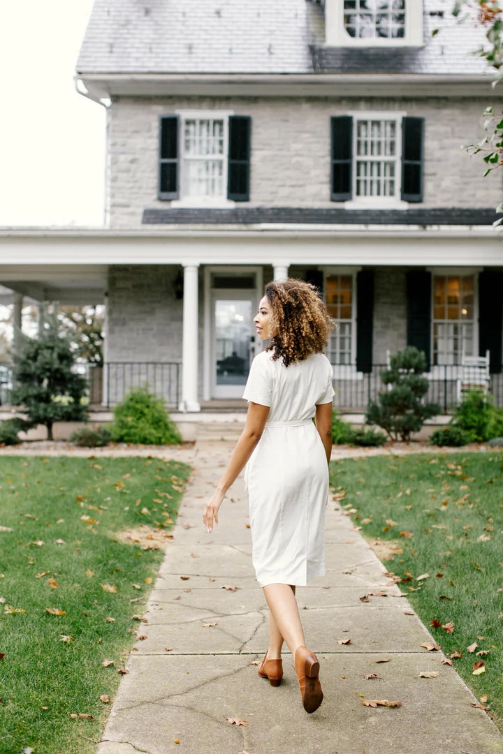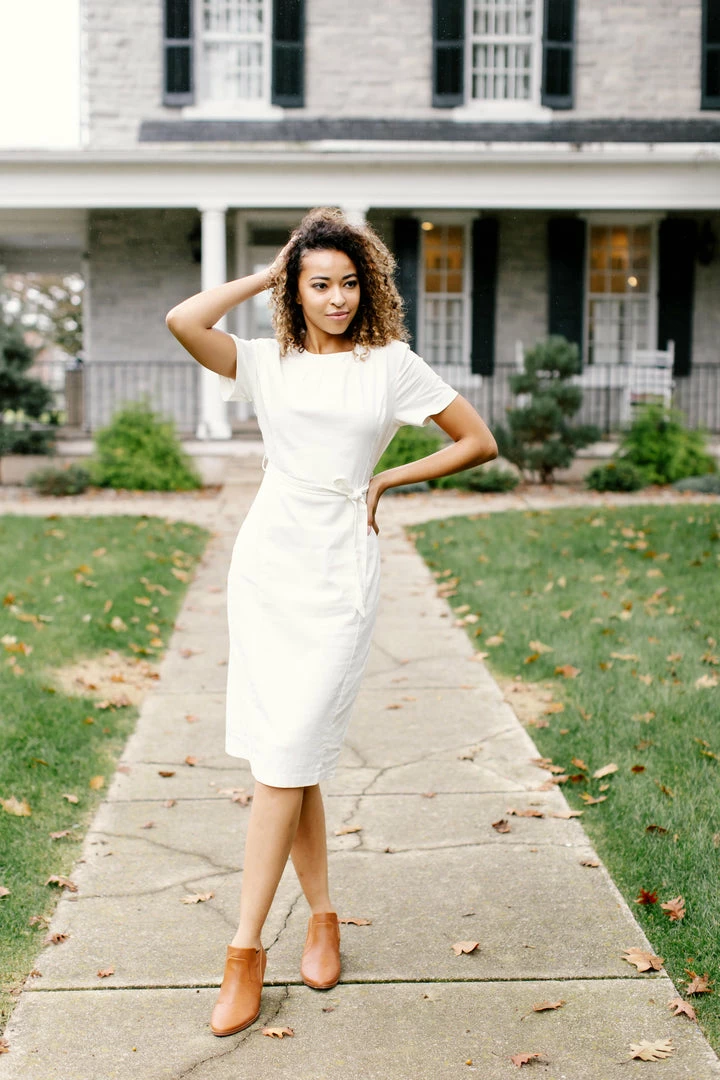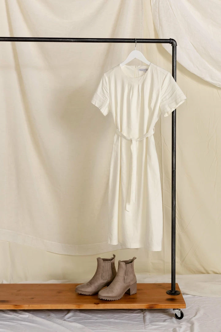 The simply elegant ‘Elise’ Dress will be a staple piece in your wardrobe for years to come! Standout details include the modest pleated neckline, simple sleeves, and a linen blend that will age beautifully. This dress features princess cut seams and a tie waist for a perfect and flattering fit and it is fully lined for effortless styling! Create a business casual look with loafers and a textured blazer or add chic pumps and a leather tote for a sophisticated style.Â