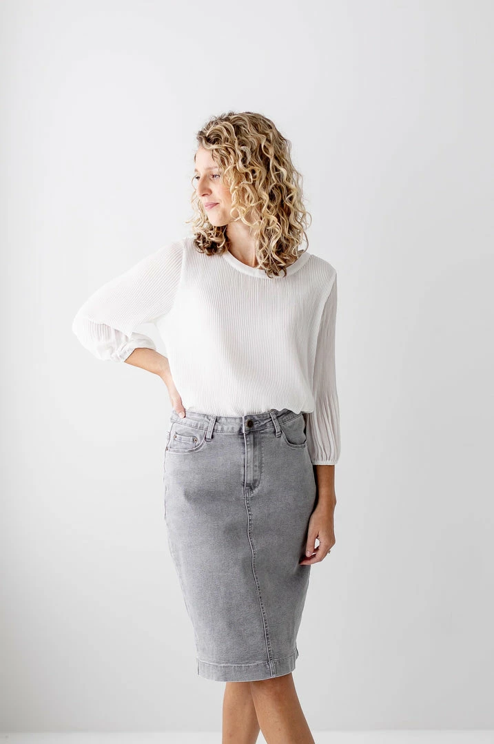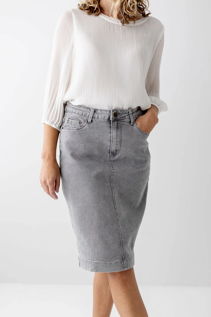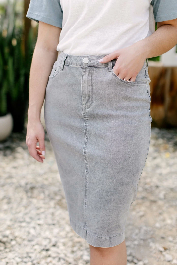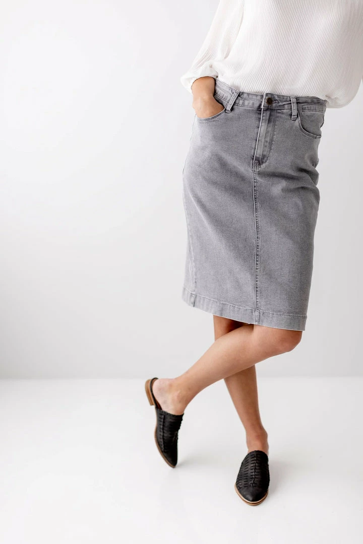 Feminine, with retro vibes; our best-selling Leah Denim Skirt is back in a new vintage gray wash! The simple lines of the denim skirt are effortless and timeless, creating a flattering fit you’ll feel confident in. The skirt is made out of stretch denim – with no slits – to keep you comfortable all day while still being modest! Designed by us with you in mind, we think you are going to fall in love with this skirt as much as we did!Â
