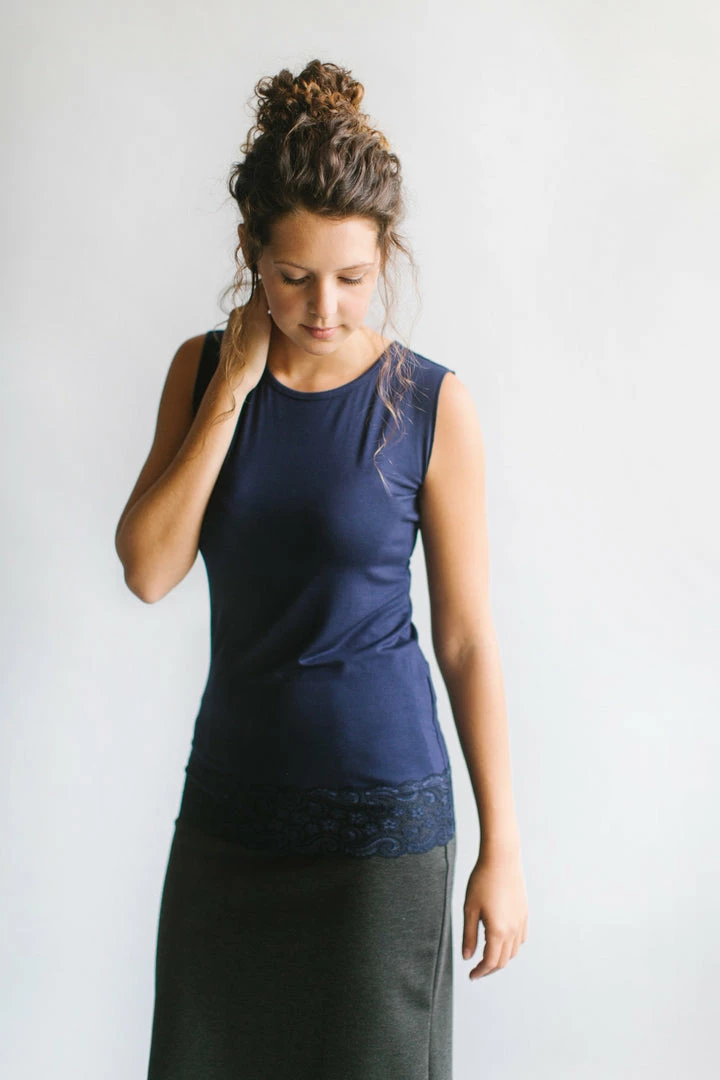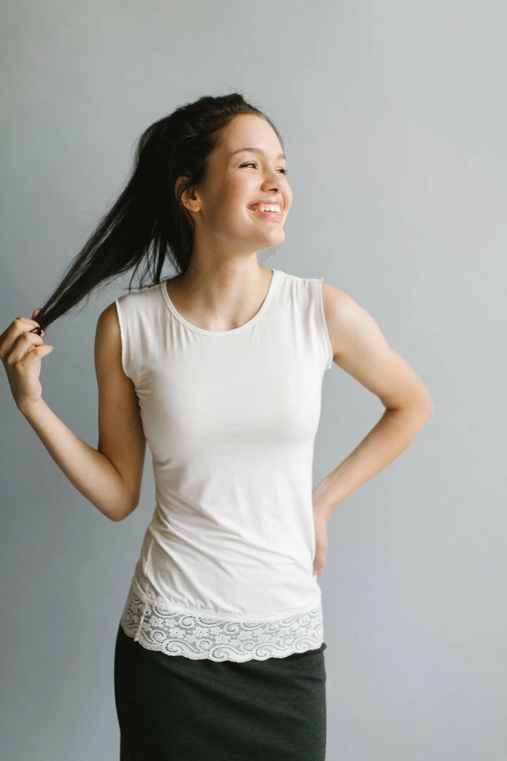 This layering tank is an updated design from our original lace trimmed layering tank. We have used a softer fabric and a higher quality lace that washes well! This updated design also has full shoulder coverage. This is a layering tank that will become an essential part of your wardrobe!