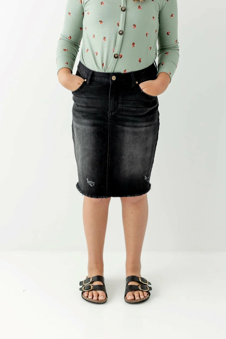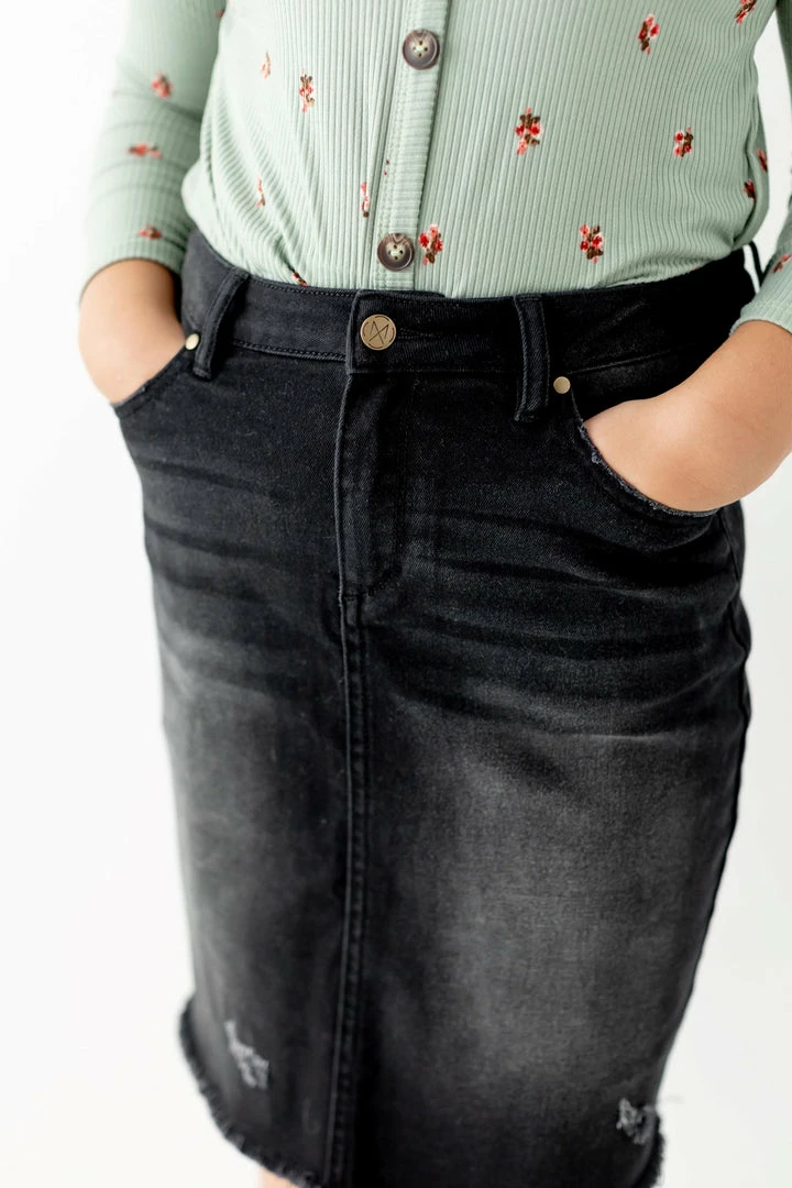 From the classroom to hanging out with friends – this cute and comfy denim skirt is up for the adventure! The ‘Nala’ is made from a quality denim with just the right amount of stretch for all day comfort. It has functional pockets, the perfect amount of distressing, and a modest below-the-knee length. Featuring an adjustable waistband for a secure fit through growth spurts! Exclusively designed by us for you.Â