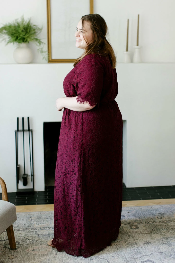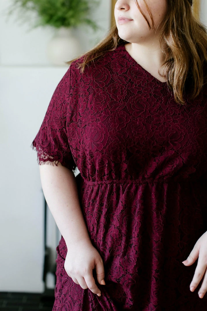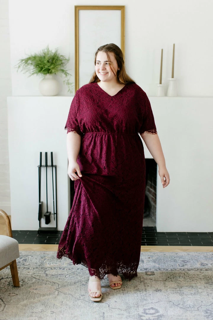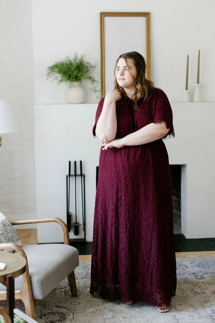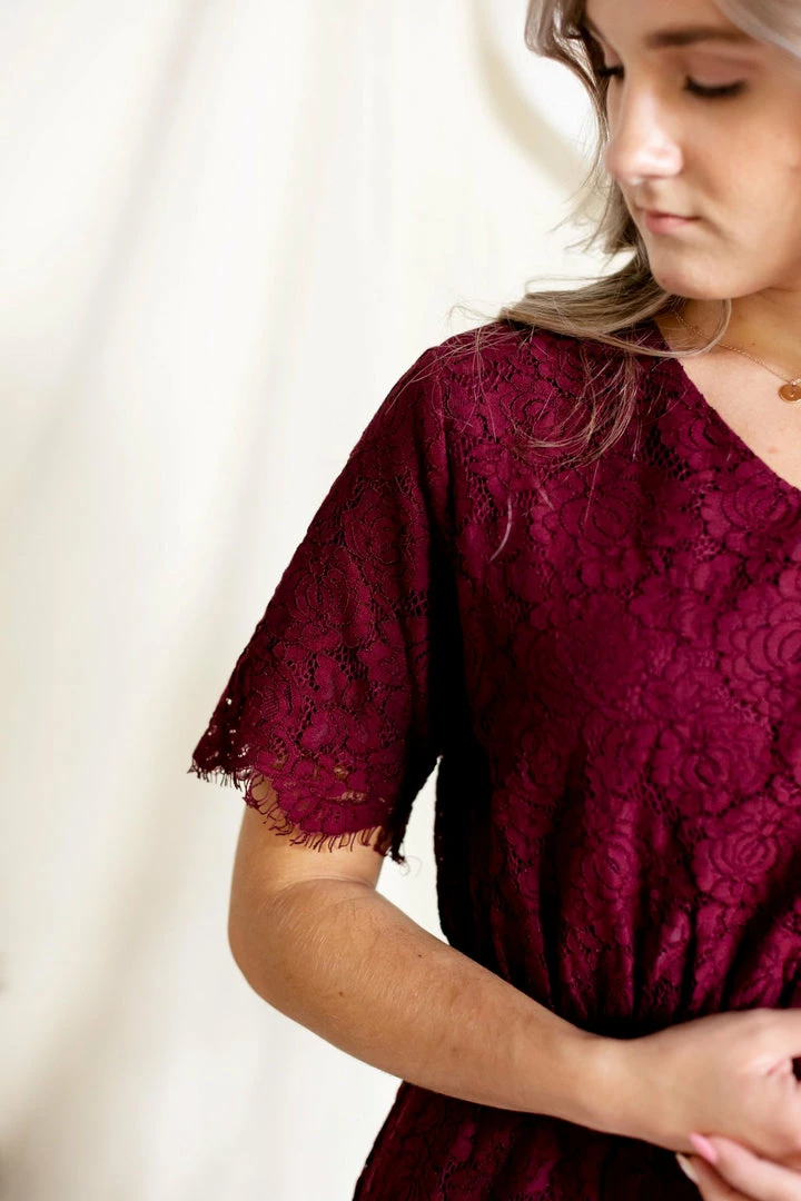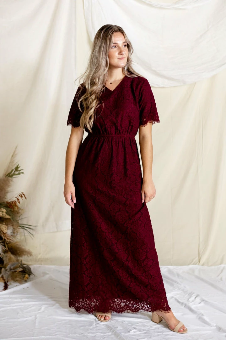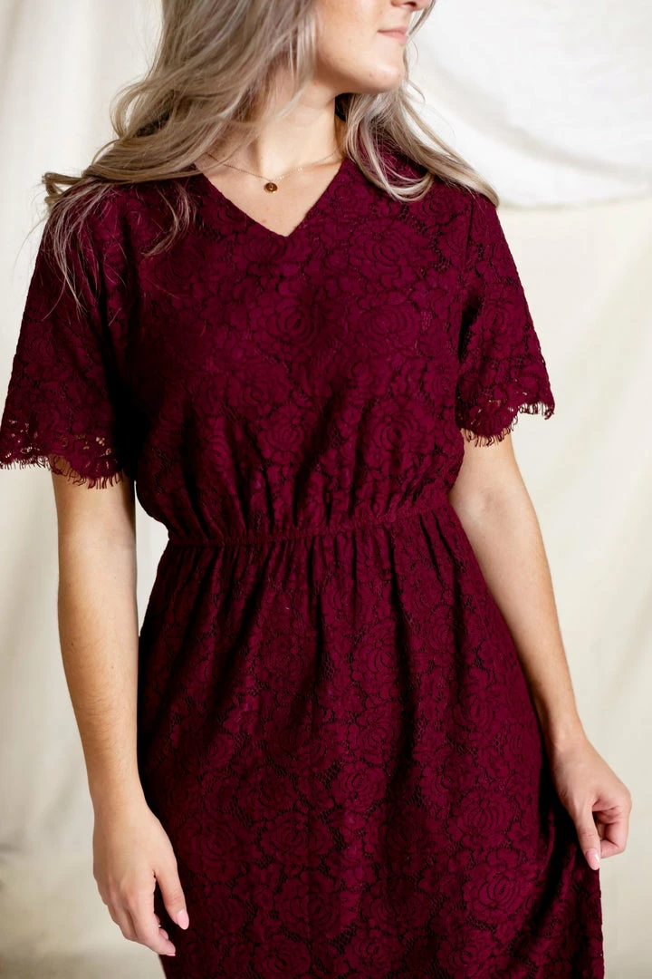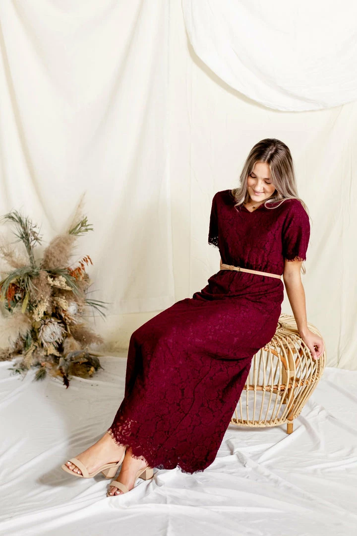 The ‘Odessa’ is a combination of elegance, comfort, and style that will steal the show! We love the rich shade of burgundy, delicate lace overlay, modest v neckline, and the scalloped eyelash hem on this beautiful piece. The elastic waist and keyhole closure allow for ease of styling and a flattering fit. This lace dress is fully lined and requires no layering, creating a look that is both effortless and timeless! The burgundy color will shine at any special occasion or photoshoot! Exclusively designed with you in mind.Â