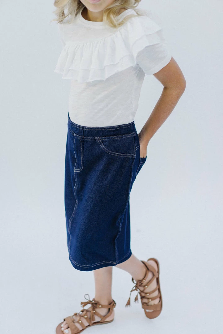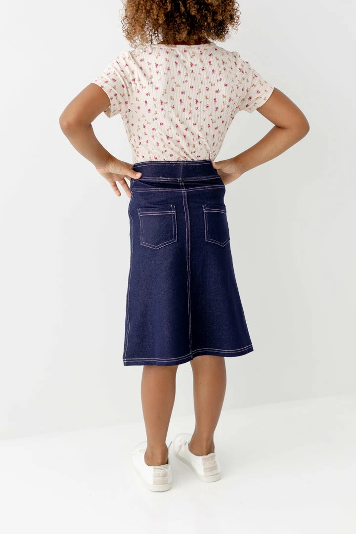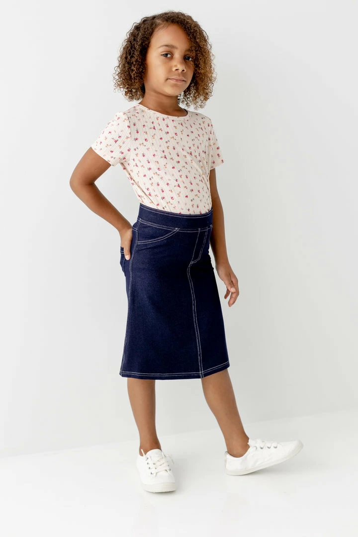 Looks like denim, feels like a dream! There’s room to move in the comfortable ‘Piper’ skirt! With easy pull-on style and functional back pockets, this skirt will quickly become a favorite in any girl’s closet.Â