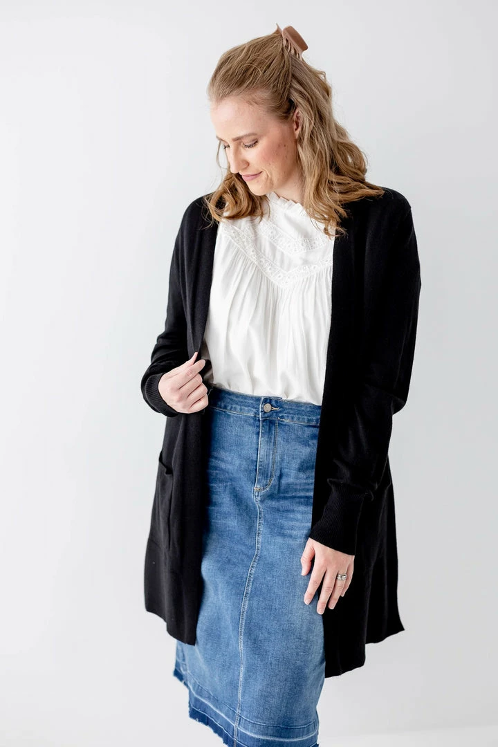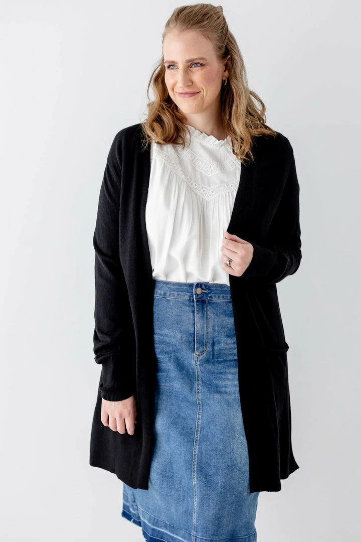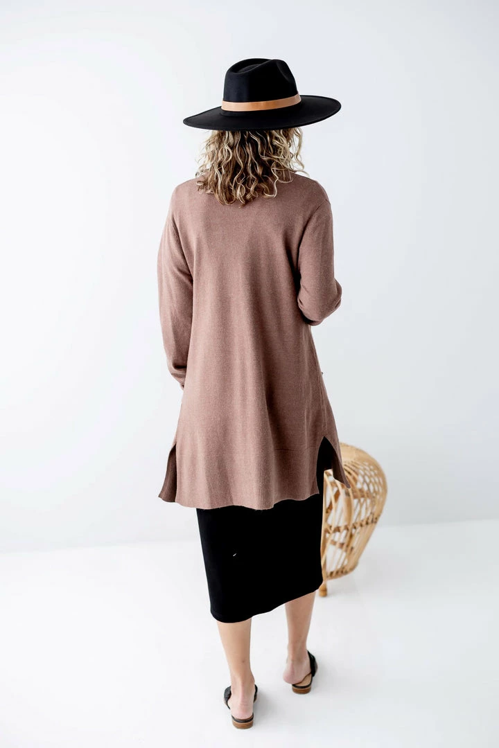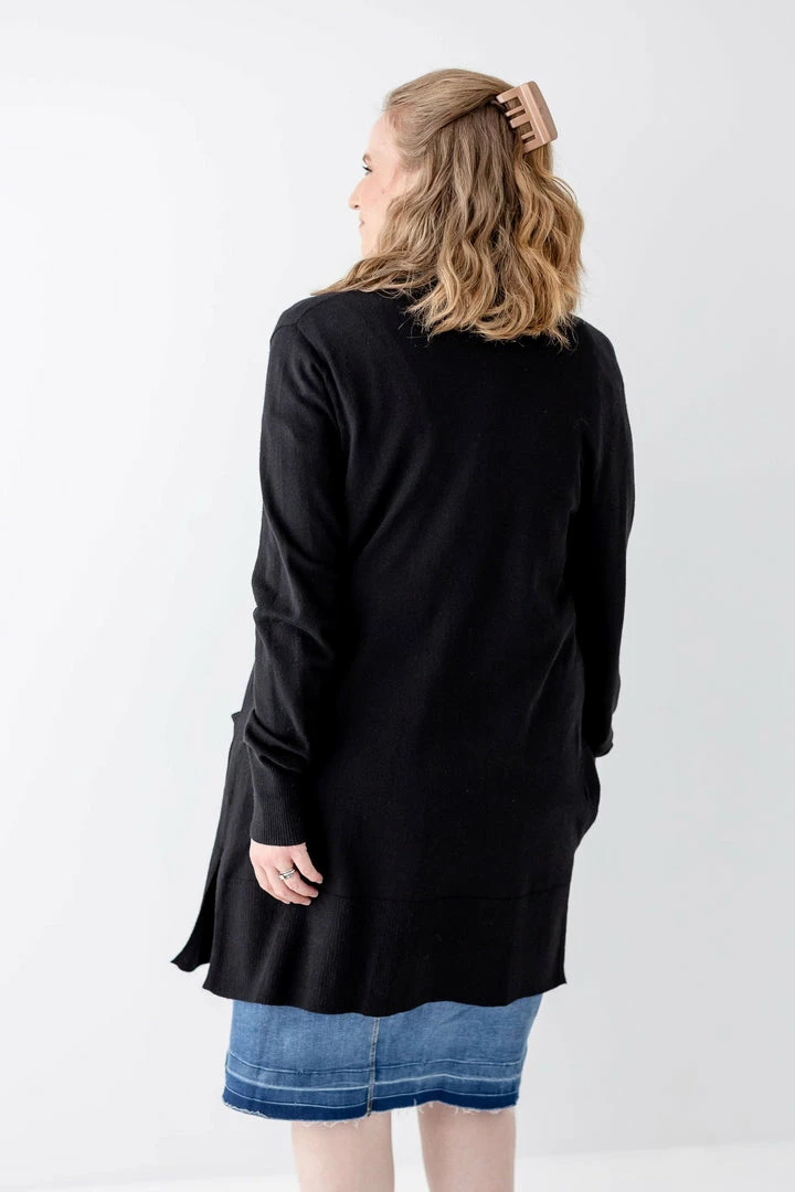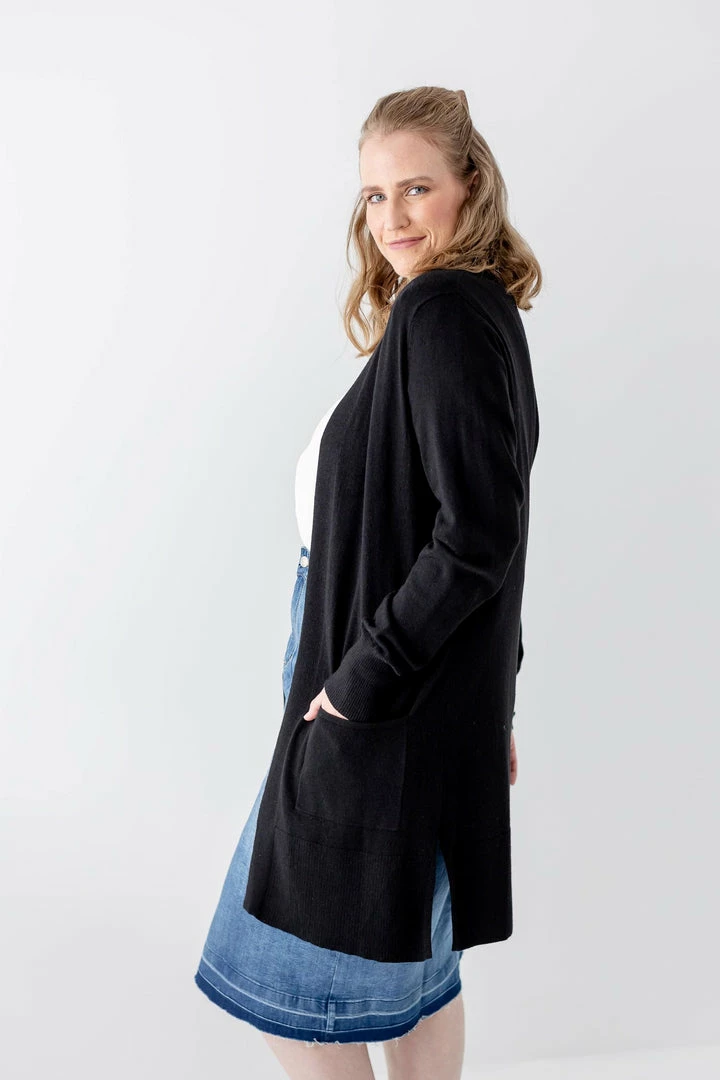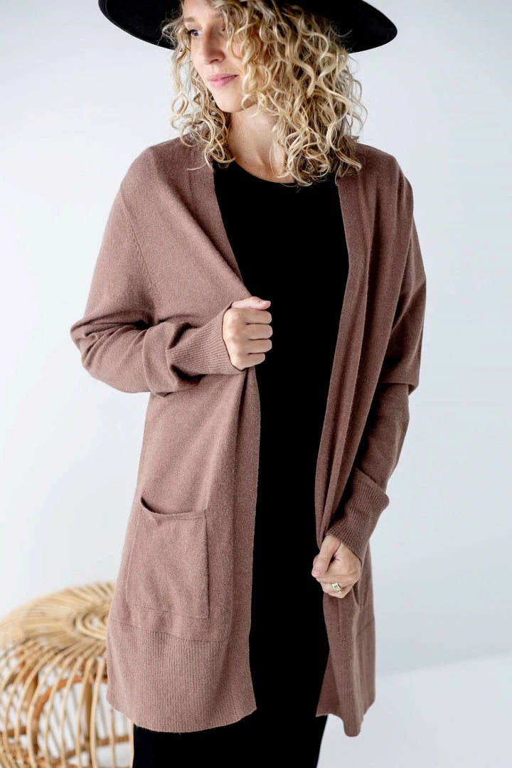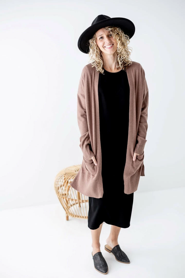 Meet our first ever exclusively designed cardigan! Here to elevate your cozy looks and become a new favorite in your cool weather rotation. The Porter Cardigan is tailored from soft knit fabric for comfortable wear and features an open front design in a modern fit that falls below the hip for effortless layering. Ribbed detailing at the wrists ensure a perfect fit while pockets add fun flair! Pair the Porter Cardigan with a denim skirt and casual tee for a relaxed look or over a dress for special occasions! Choose from a timeless black or neutral chestnut.Â