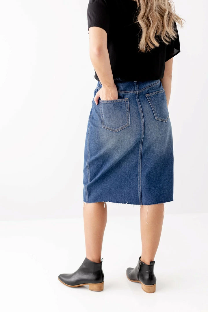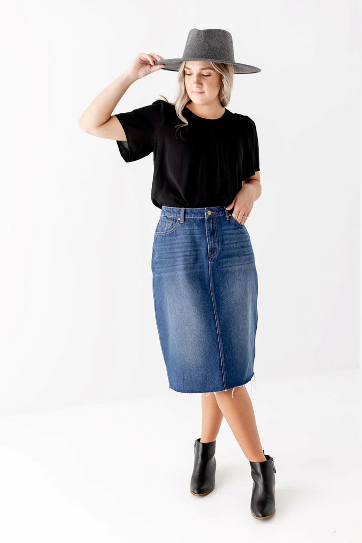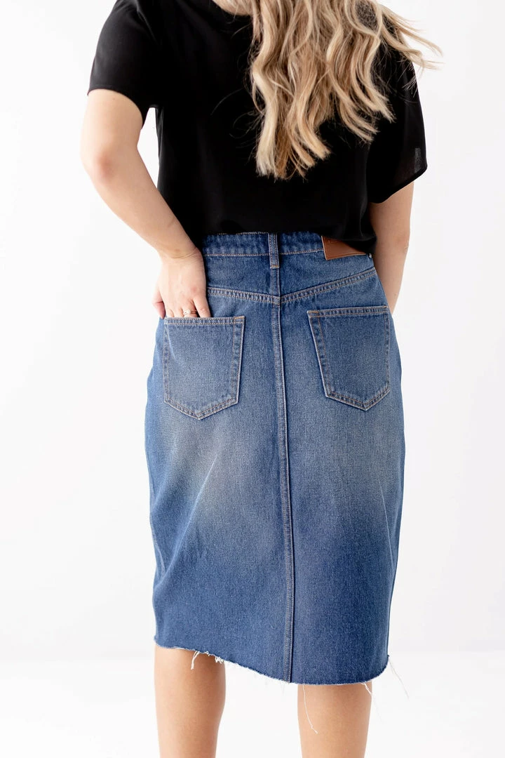 Denim is always in and every modest wardrobe needs a classic denim skirt! What sets the ‘Rae’ Denim Skirt apart from the rest? Quality, structured denim, below-the-knee length, and a raw hem for the finishing touch! The timeless medium wash creates endless styling opportunities for your unique style. Designed for everyday wear with functional front and back pockets and a high waist design that will have you feeling put together all day long. The raw hem can easily be cut to make this skirt your desired length! Exclusively designed by us for you!