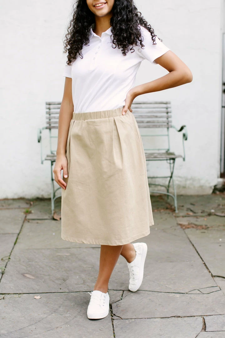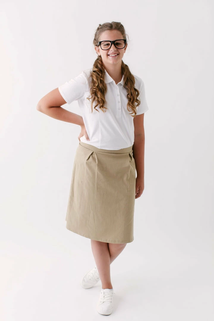 We are happy to offer modest uniform skorts for the scholars! Exclusively designed and made from a classic and durable fabric with a flat waistband and pleats. The knee-length ‘Remy’ looks like a skirt from the front and back. There are soft knit shorts sewn into the waistband for comfort in the classroom and modesty on the playground.