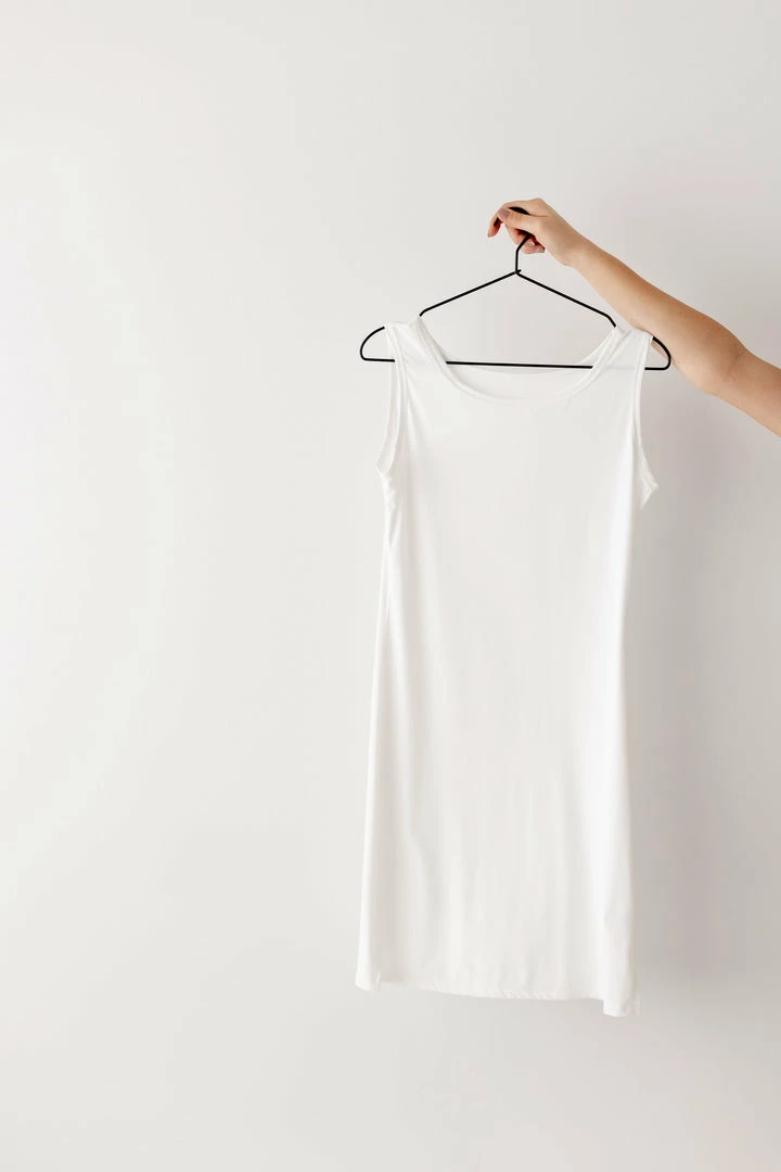 Endlessly versatile, this modest layering slip is designed to be worn under dresses for ultimate coverage! Cut with a flattering scoop neck that is perfect for raising a neckline or wearing under a sheer dress without bulk. The reversible neckline is tag free both front and back for easy styling. Available in black or white.Â