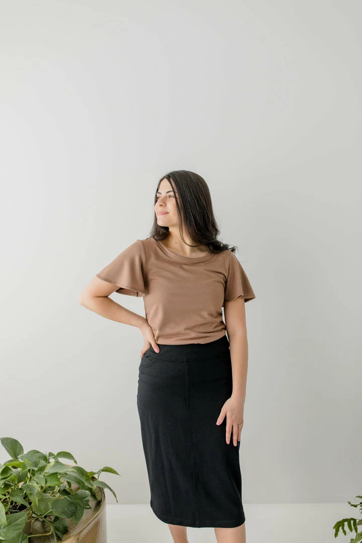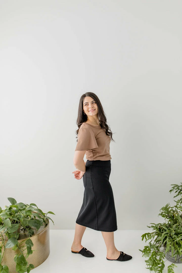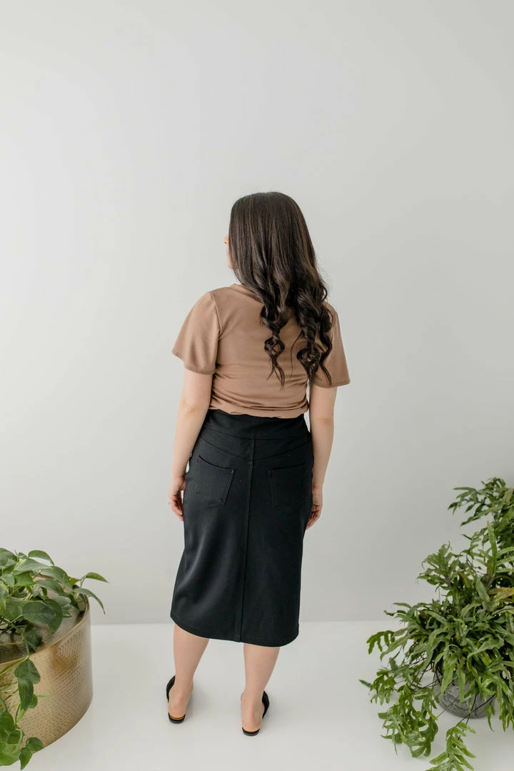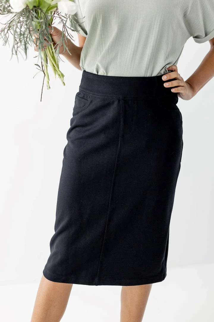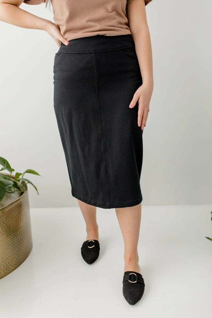 Classic black meets the comfort of stretchy knit denim! The ‘Sara’ Knit Denim Skirt in black is a wardrobe must-have that you’ll reach for again and again. Featuring a wide waistband for a super-comfy fit and functional back pockets. You can style this stretchy skirt with a simple tee or a flowy top. You won’t have to sacrifice style or comfort with this one!Â