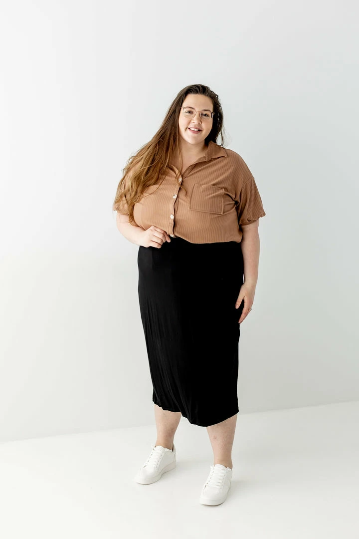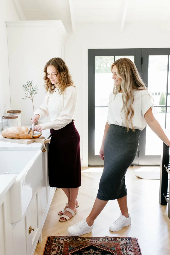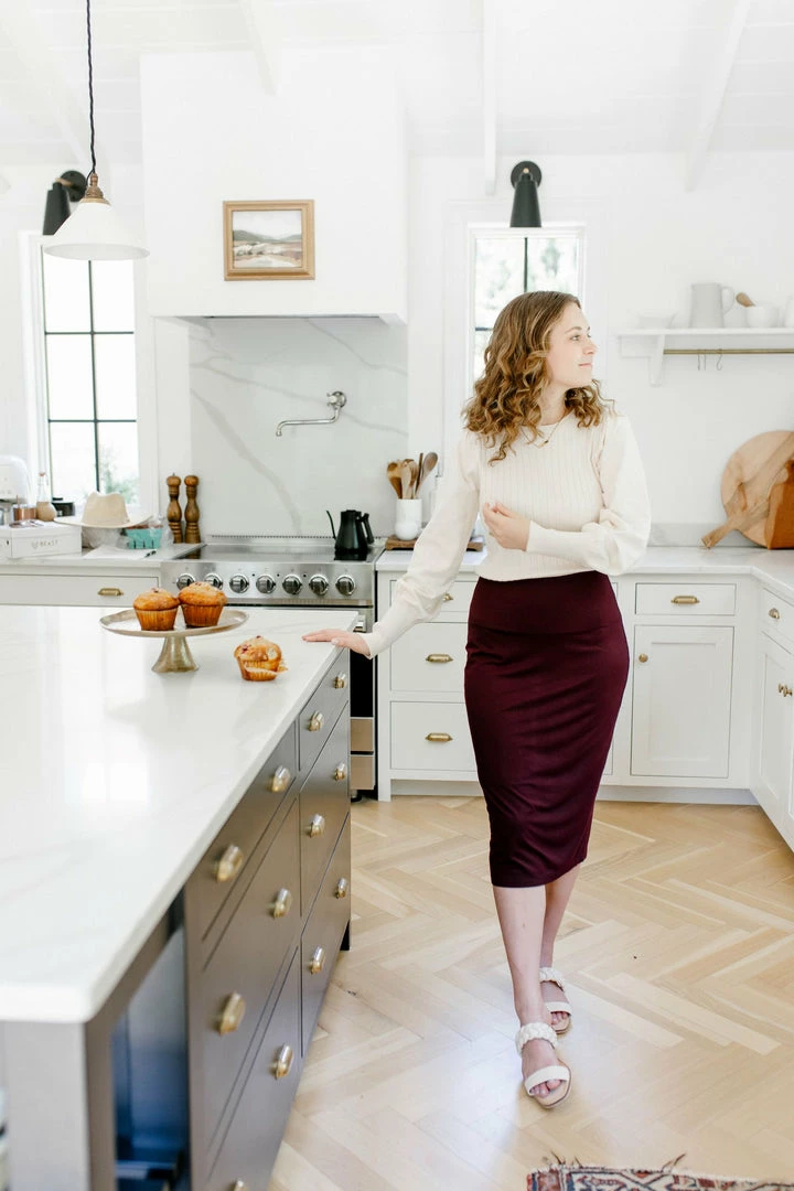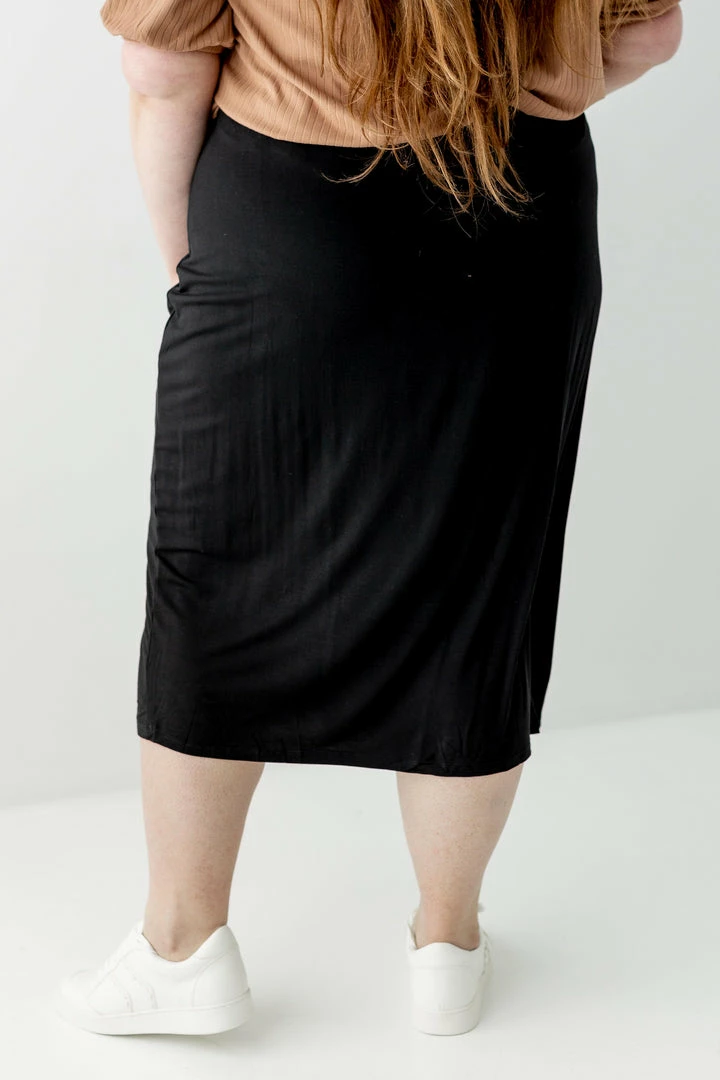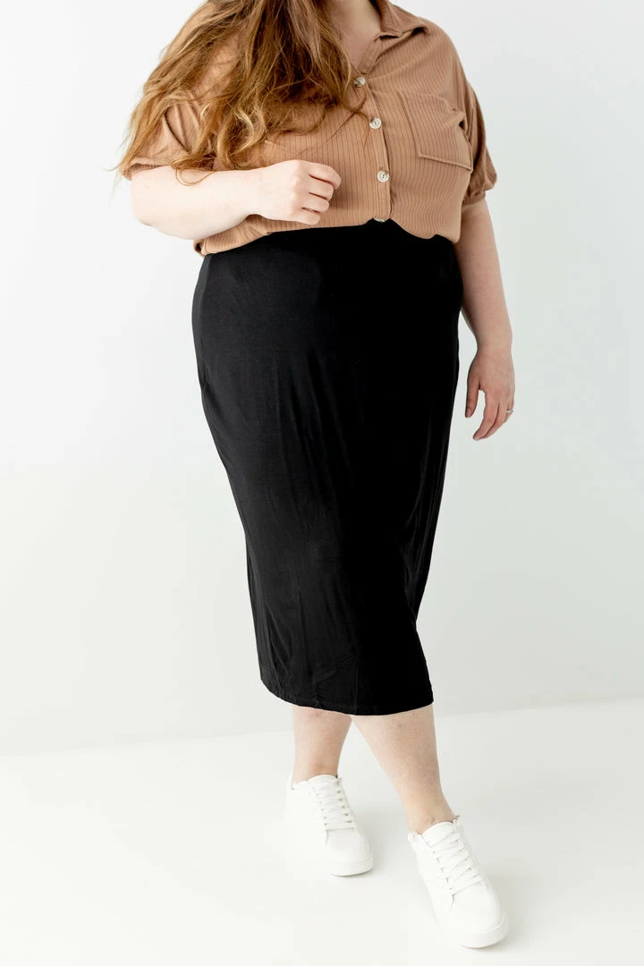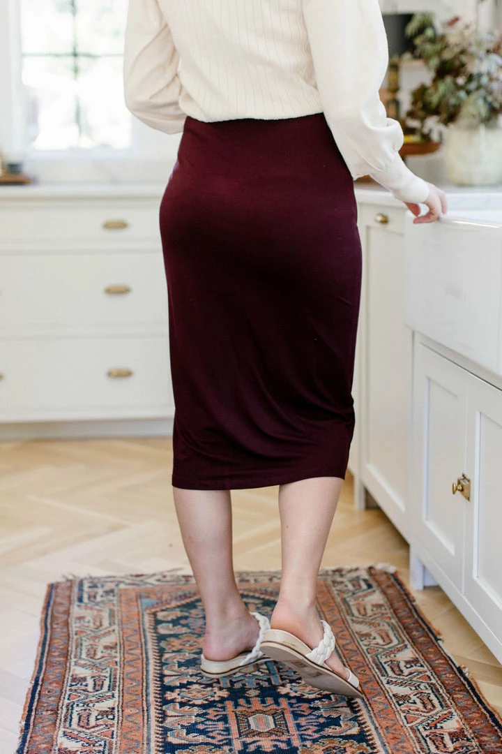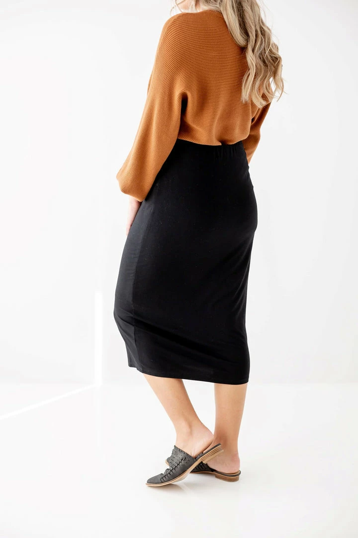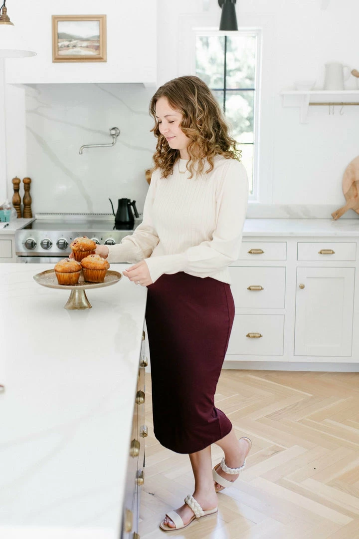 Everyday glam doesn’t get easier than the pull on Sasha skirt! It’s effortless and elegant – what skirt dreams are made of! Tailored in a modern midi length, this soft knit skirt is fitted with a hidden elastic waistband for a secure fit. From everyday wear to business casual to Sunday morning – this basic skirt is a must have for every modest wardrobe! Exclusively designed with you in mind.Â