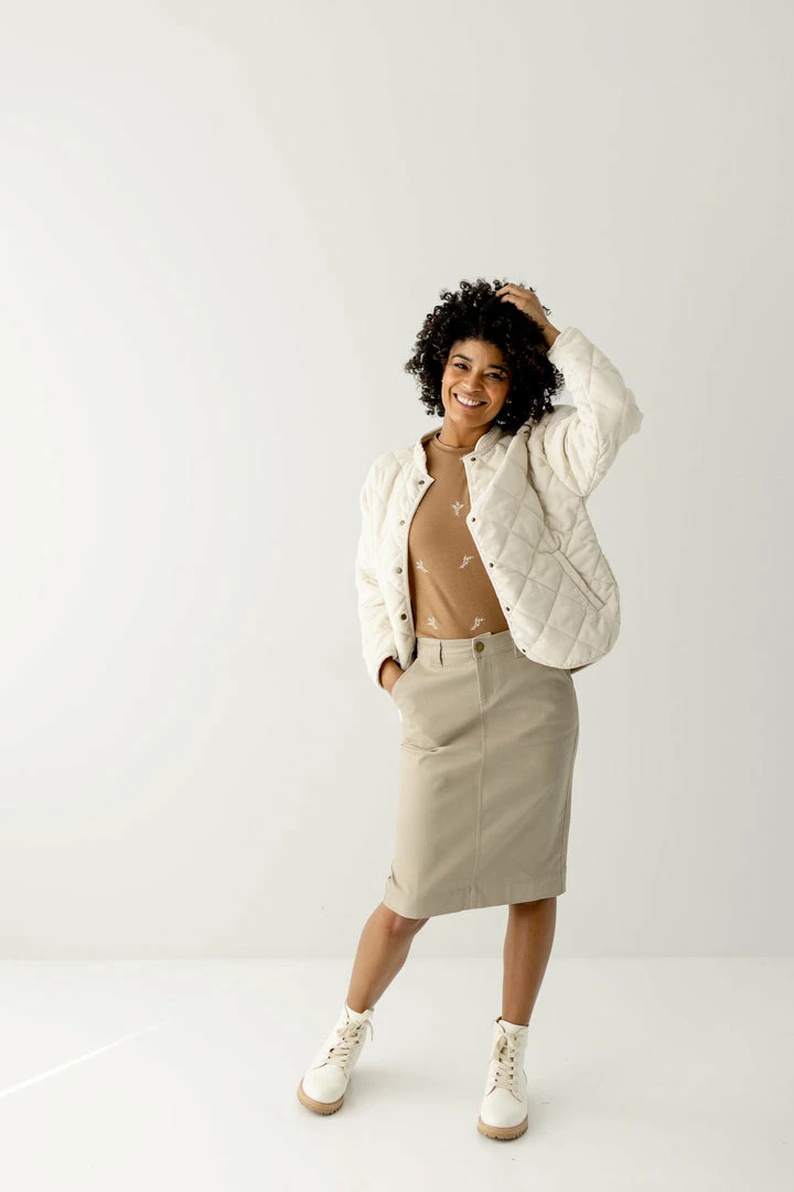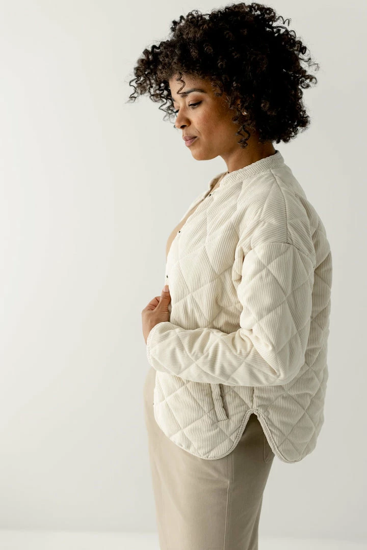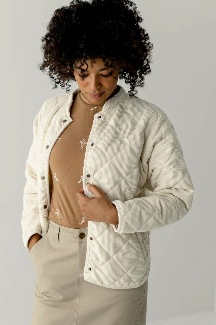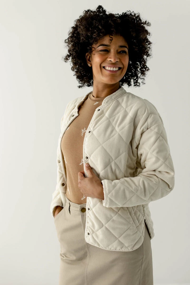 Add an element of fun to your spring layering with the Dustin jacket! The soft corduroy fabric features a quilted construction with a channel-stitched design for enhanced warmth with an elevated look. Snap closures and pockets make the Dustin as functional as it is cute. Pair with a tee and denim skirt for a day out on the town!